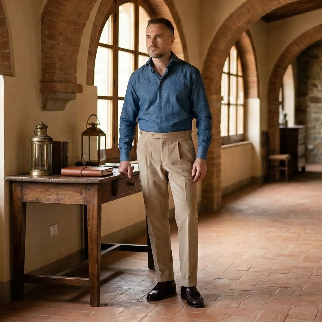 Il pantalone sartoriale Contemporary in 100% caldo cotone Beige Plain rappresenta uno dei modelli più versatili e raffinati della nostra collezione. Realizzato interamente a mano in Italia, unisce una linea elegante a un comfort superiore grazie alla morbidezza del cotone a trama fitta, ideale per l’autunno e per i primi mesi invernali.