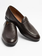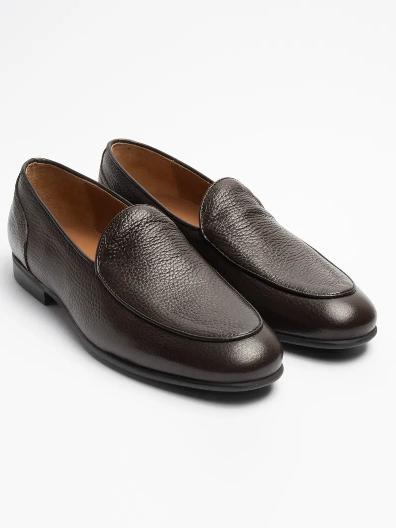 Mocassino artigianale realizzato in pelle di vitello bottolata color moro, perfetto per chi cerca uno stile classico ma attuale. La finitura bottolata conferisce alla tomaia un aspetto ricco e testurizzato, mentre la suola in gomma assicura comfort e aderenza durante tutta la giornata. Elegante e versatile, si adatta con naturalezza a outfit formali e look più rilassati.