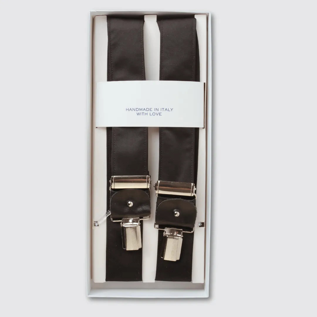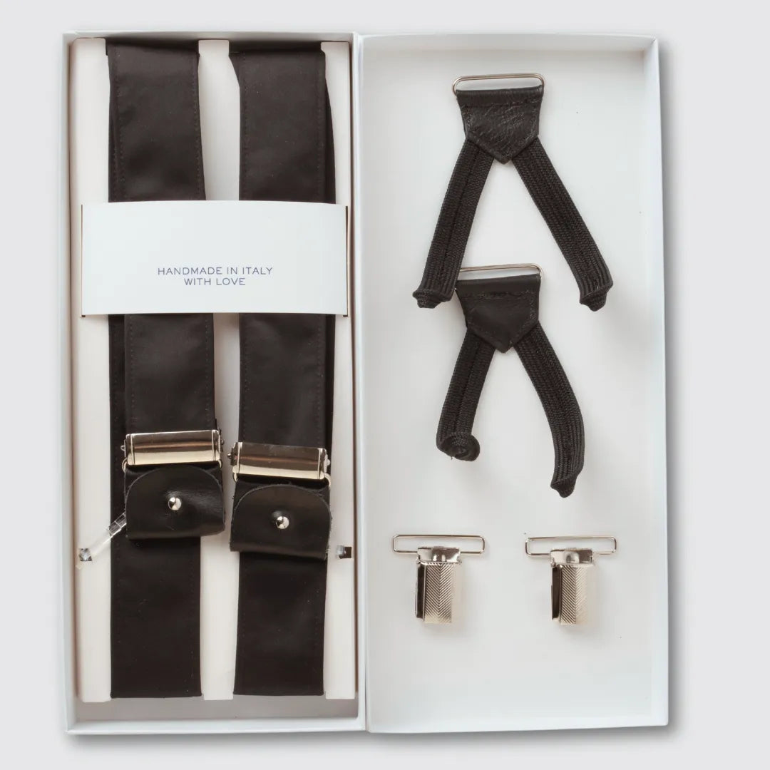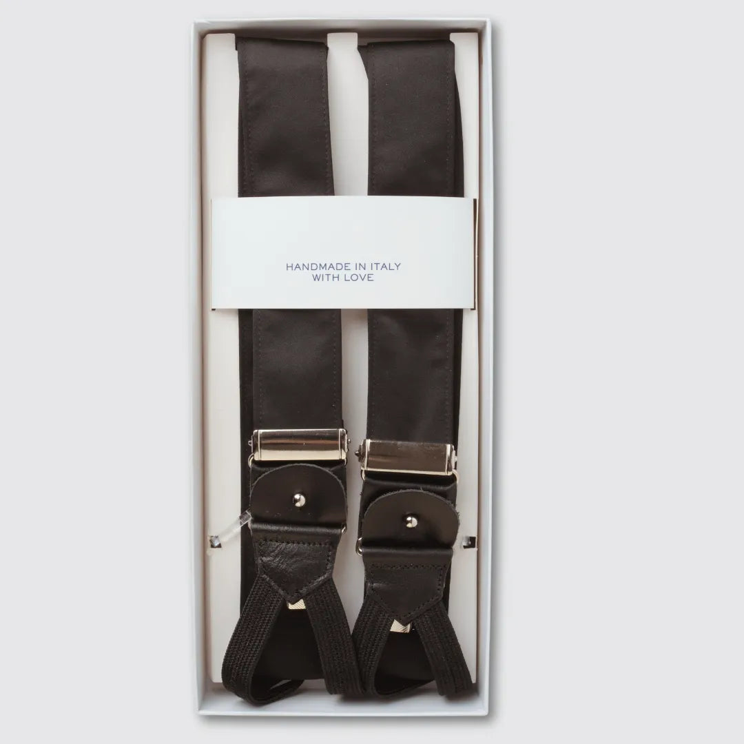 Un accessorio raffinato e sofisticato, ideale per completare look formali e da cerimonia. La bretella ibrida in raso nero combina eleganza e praticità grazie al doppio sistema di chiusura con clip o bottoni. Realizzata artigianalmente in Italia, è un simbolo di stile e qualità sartoriale, perfetto per ogni occasione speciale.