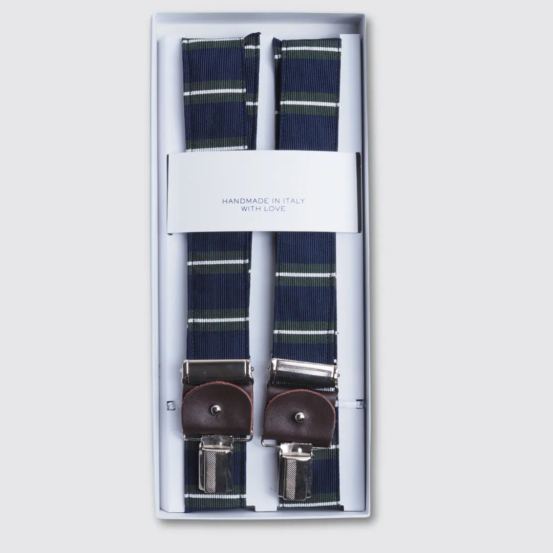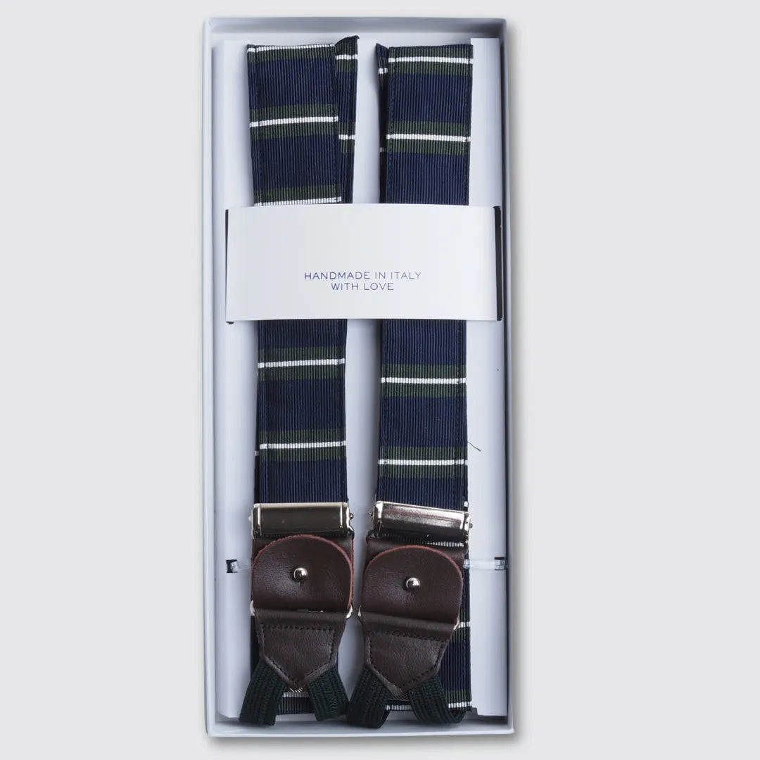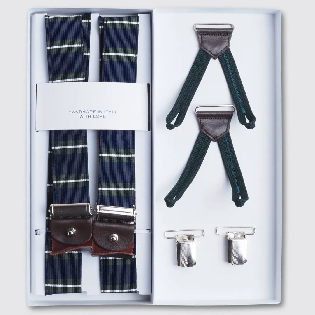 Le bretelle ibride in 100% seta sono l’accessorio perfetto per chi cerca eleganza e versatilità. Caratterizzate da una fantasia a righe nei toni del blu, verde e bianco, si adattano sia agli outfit formali che a quelli più casual. Il loro design ibrido consente di scegliere tra chiusura a clip o con bottoni, garantendo massima flessibilità e personalizzazione. Un dettaglio sartoriale esclusivo, realizzato artigianalmente in Italia.