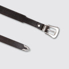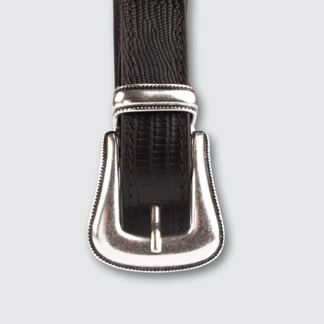 Un mix perfetto tra eleganza e carattere, la cintura texana in pelle di vitello stampa lucertola Tejus nella variante nera è un accessorio ricercato, ideale per chi cerca un dettaglio distintivo e raffinato. La particolare texture della stampa lucertola aggiunge profondità e dinamismo al colore caldo e sofisticato del marrone scuro, rendendola una scelta perfetta per outfit eleganti e dal gusto classico.