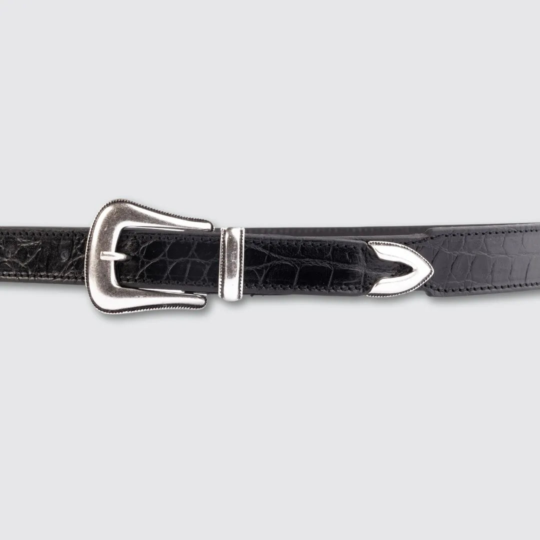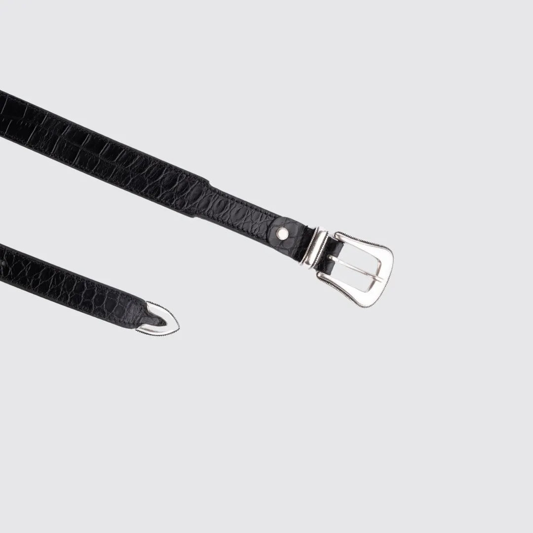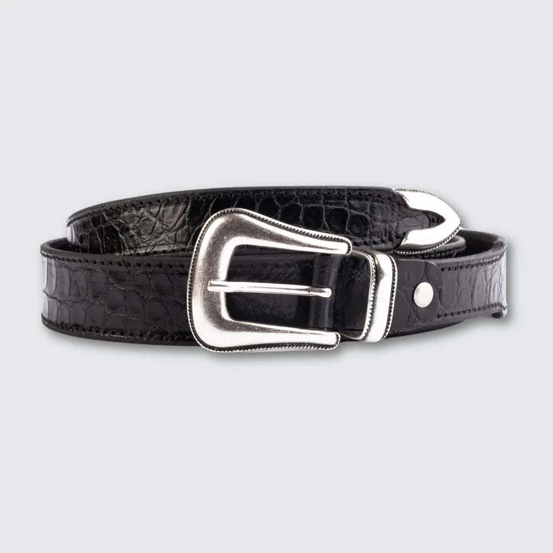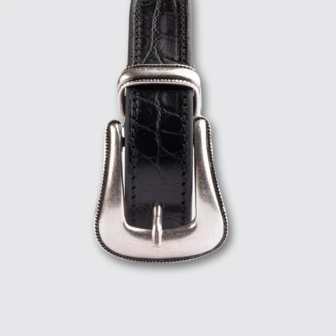 Cintura Texana in Pelle di Vitello Nero Stampa Cocco con Fibbia in Argento Anticato – Made in Italy
