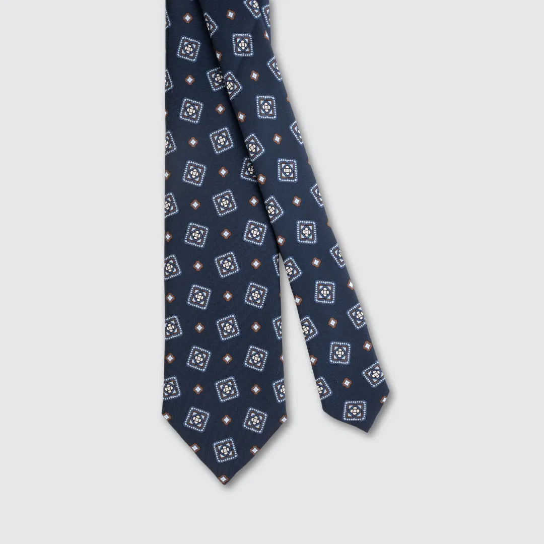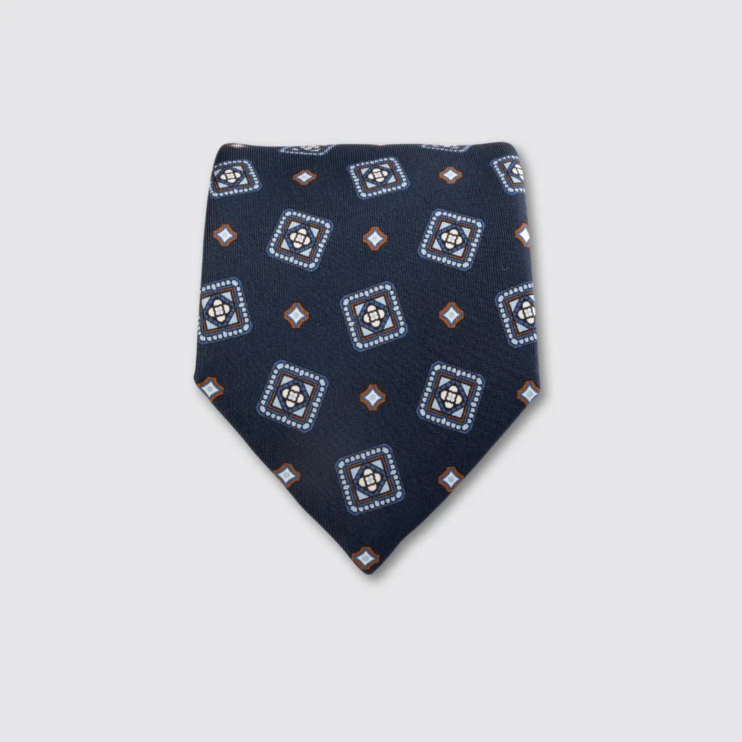 Un accessorio di classe che unisce tradizione sartoriale e raffinatezza moderna. Questa cravatta tre pieghe è realizzata in 100% seta raso stampata, impreziosita da una fantasia geometrica nei toni del bianco e del marrone su fondo blu. Un complemento perfetto per elevare ogni look con un tocco di eleganza senza tempo.