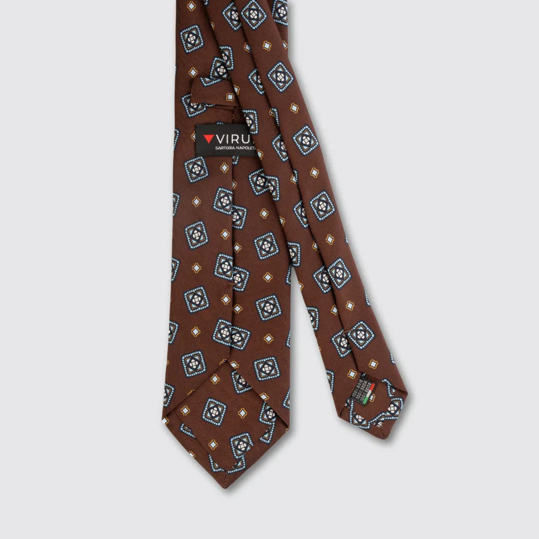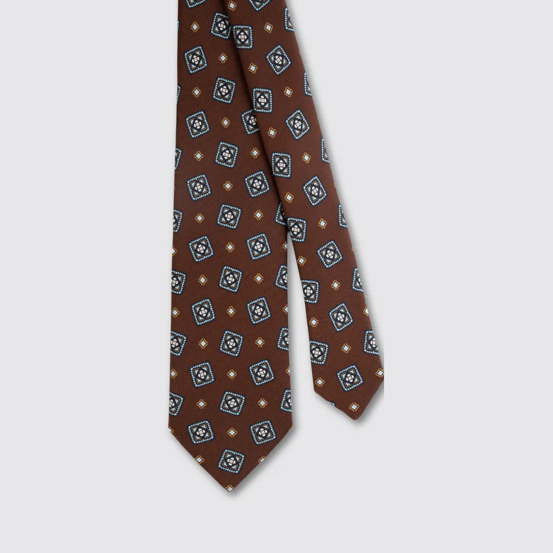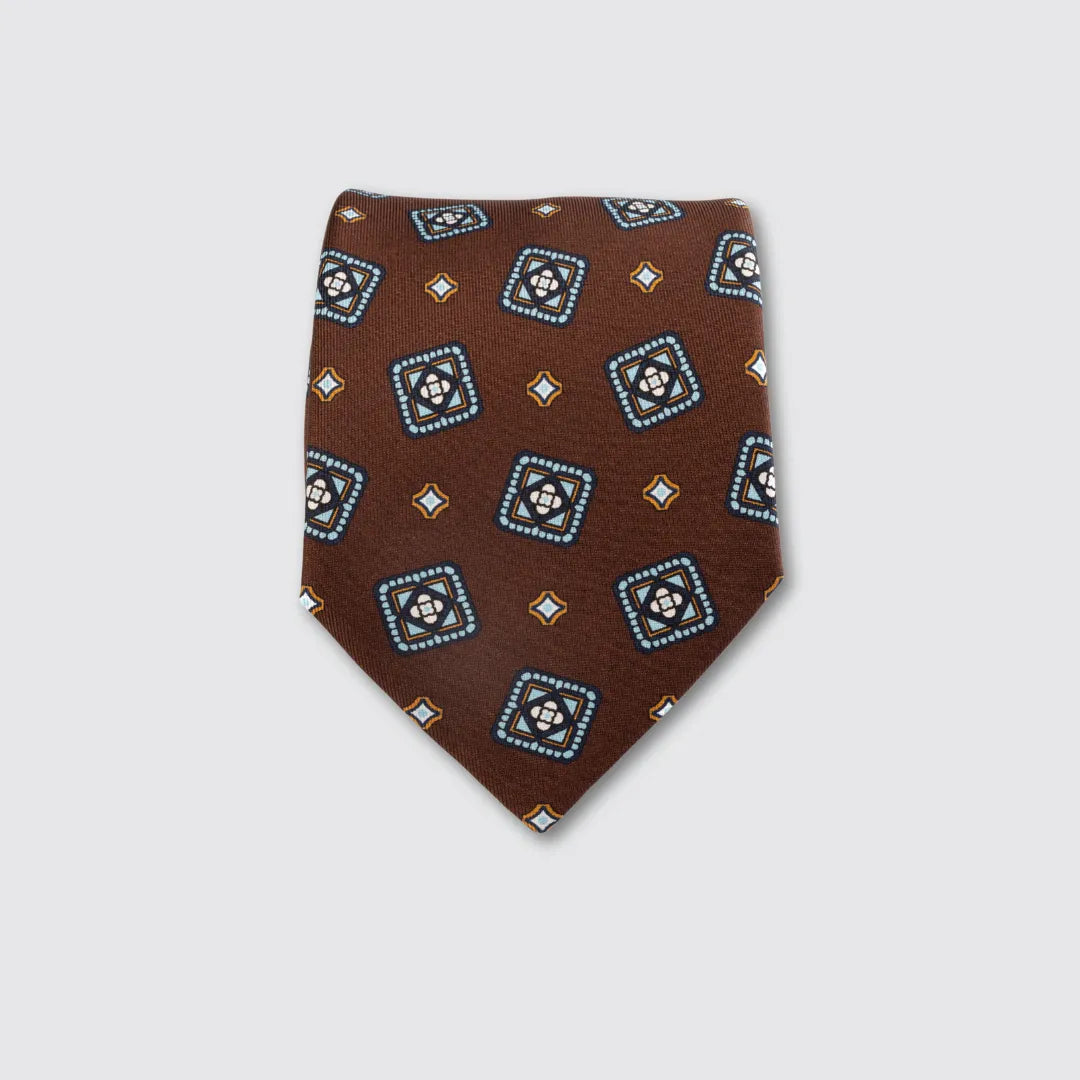 Cravatta 3 Pieghe in Seta Stampata Marrone con Fantasia Geometrica