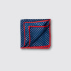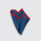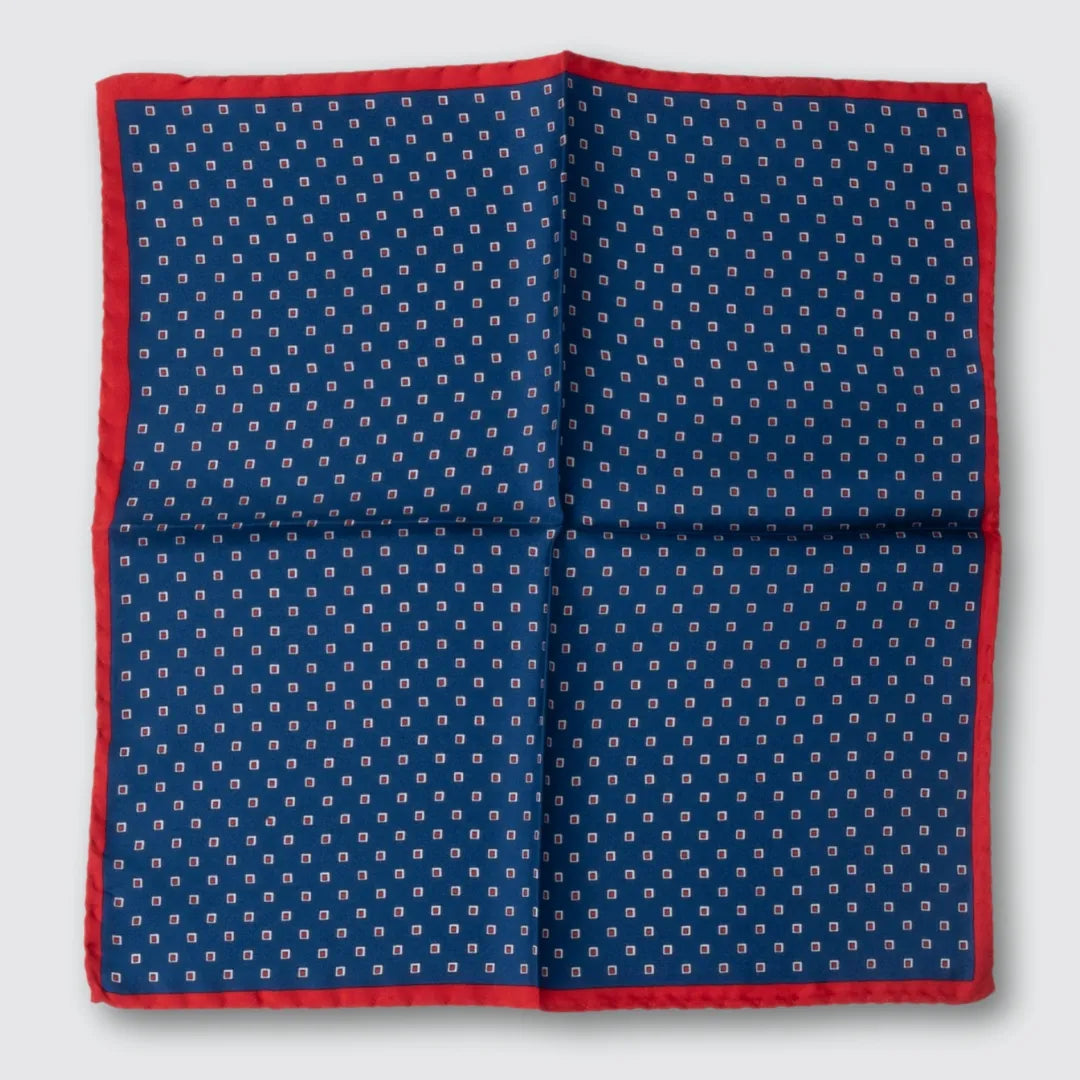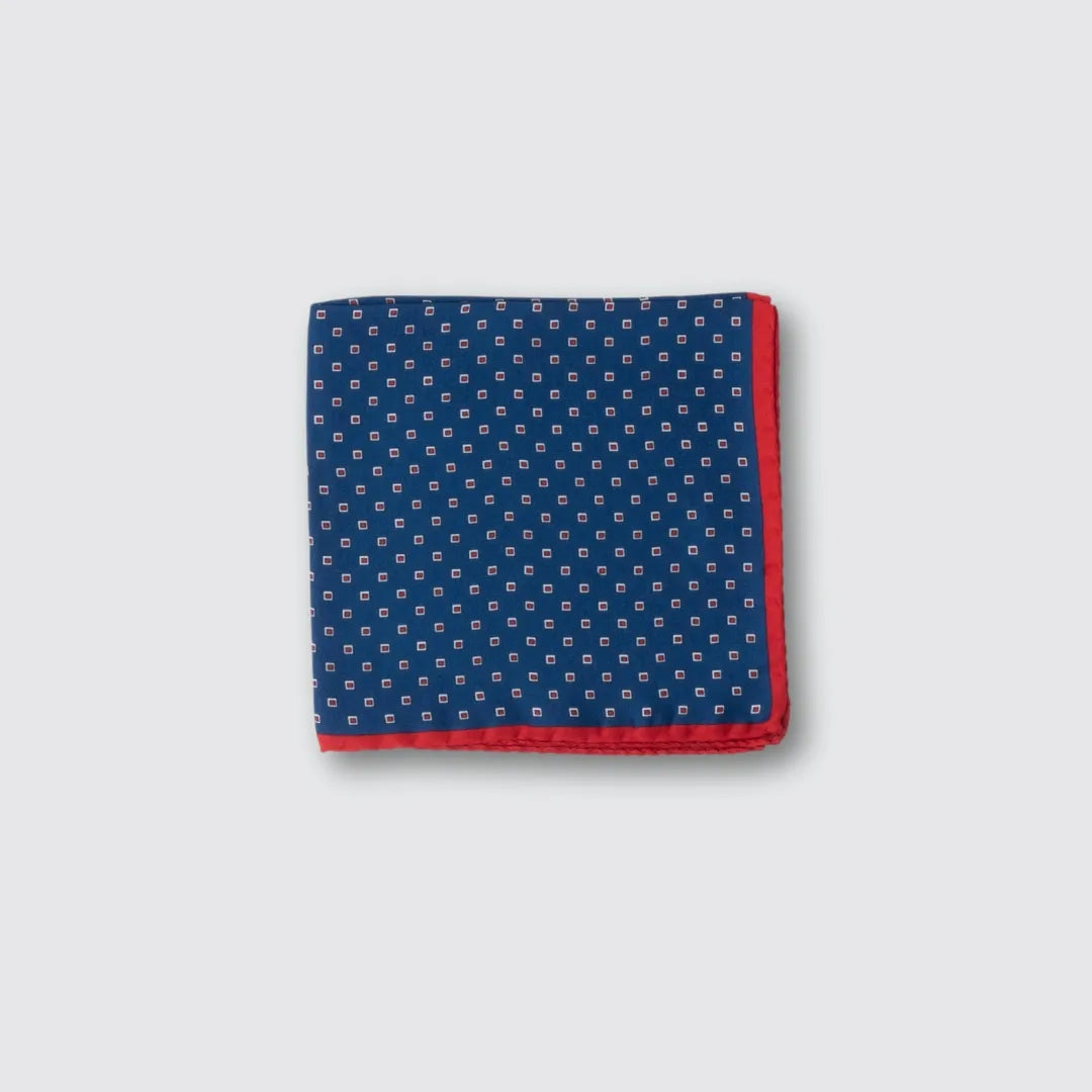 Un accessorio di classe per il gentleman moderno. La pochette da taschino in raso di seta 100% presenta un motivo geometrico a piccoli quadrati bianchi su sfondo blu, incorniciato da un bordo rosso vivace. Il contrasto cromatico dona un tocco di raffinatezza, perfetto per impreziosire sia abiti formali che outfit casual chic. Ogni pochette è orlata a mano, espressione dell'artigianalità napoletana.