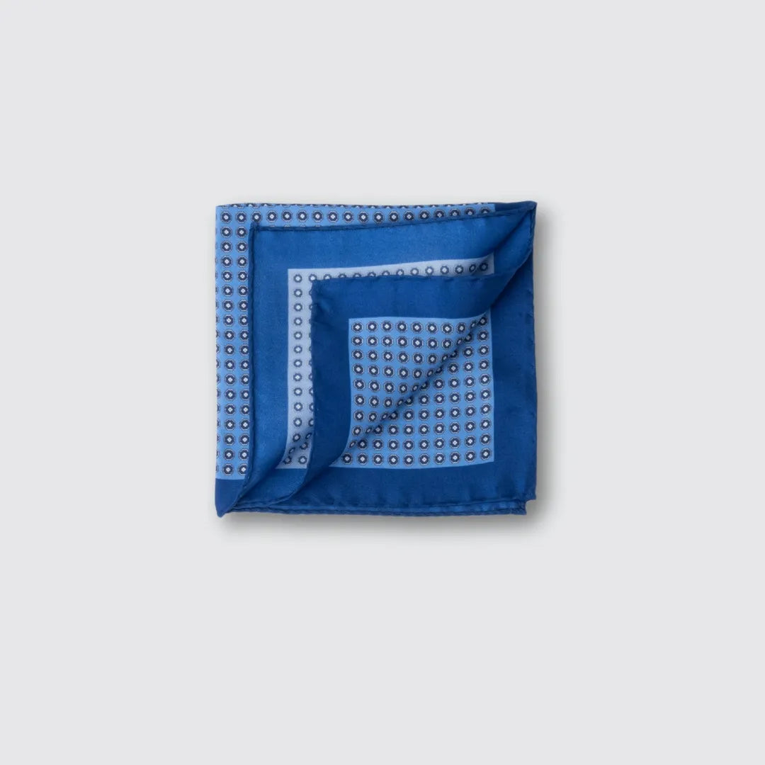 Un dettaglio sofisticato per chi ama distinguersi con classe. La pochette da taschino in raso di seta 100% presenta un motivo geometrico blu su fondo azzurro, incorniciato da un bordo blu intenso. Questa combinazione cromatica, elegante e raffinata, la rende perfetta sia per abbinamenti formali che per outfit più rilassati. Ogni pochette è orlata a mano, una lavorazione artigianale che esprime tutta la qualità della tradizione sartoriale napoletana.
