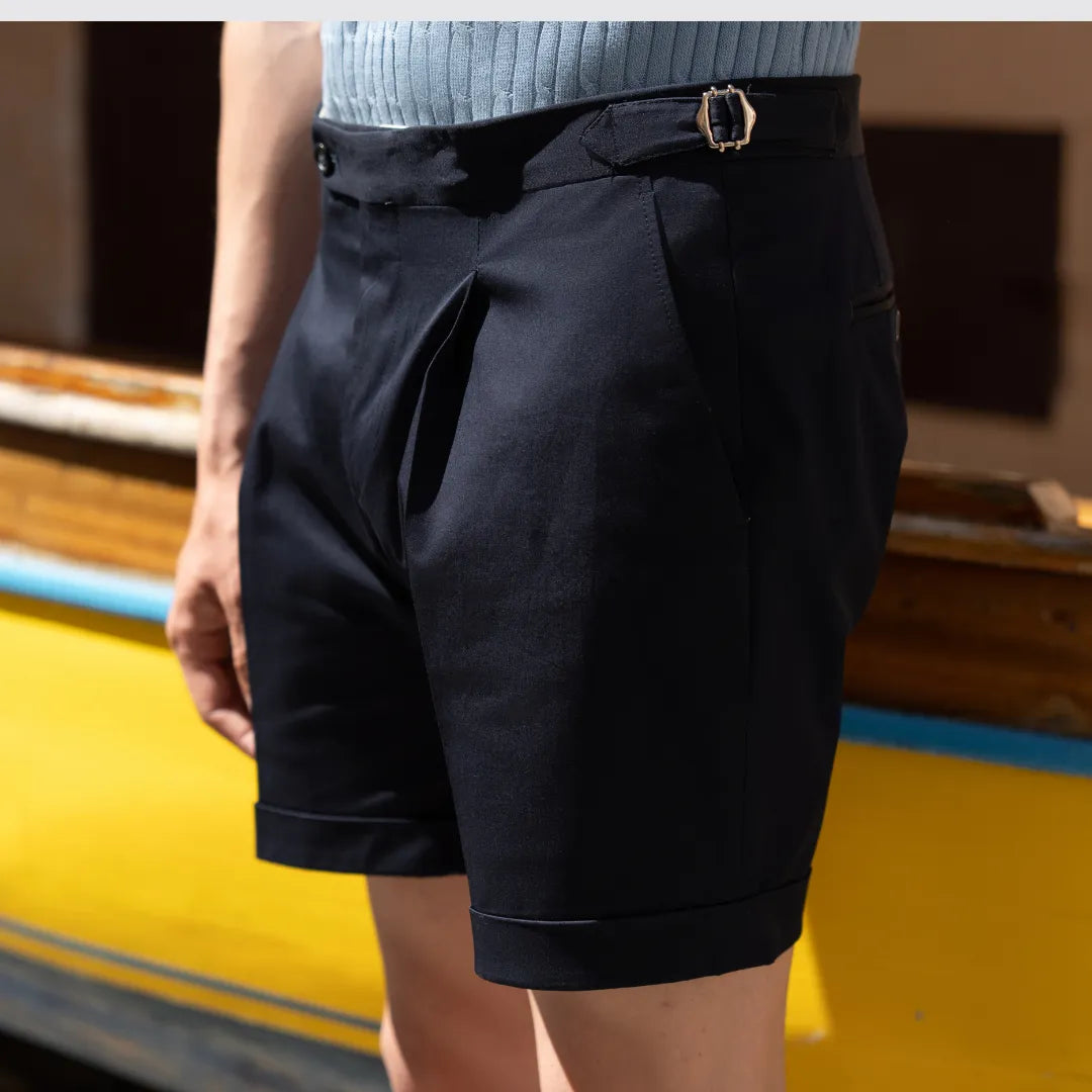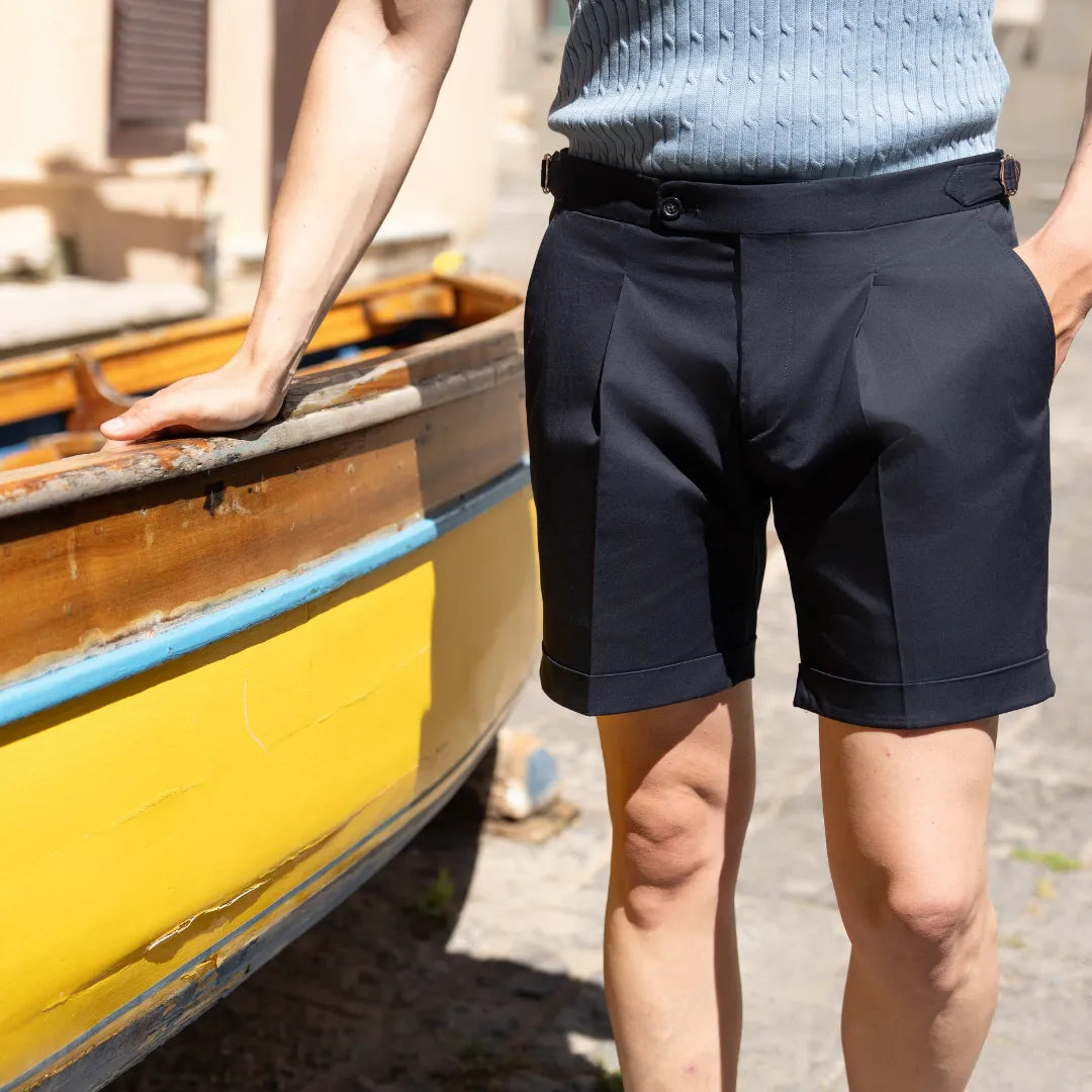 Essenziali e versatili, i nostri shorts sartoriali in cotone sono pensati per offrire comfort e raffinatezza anche nei mesi più caldi. Il taglio elegante con pinces frontali e fibbie laterali regolabili richiama i codici della sartoria tradizionale napoletana, reinterpretati in chiave estiva.