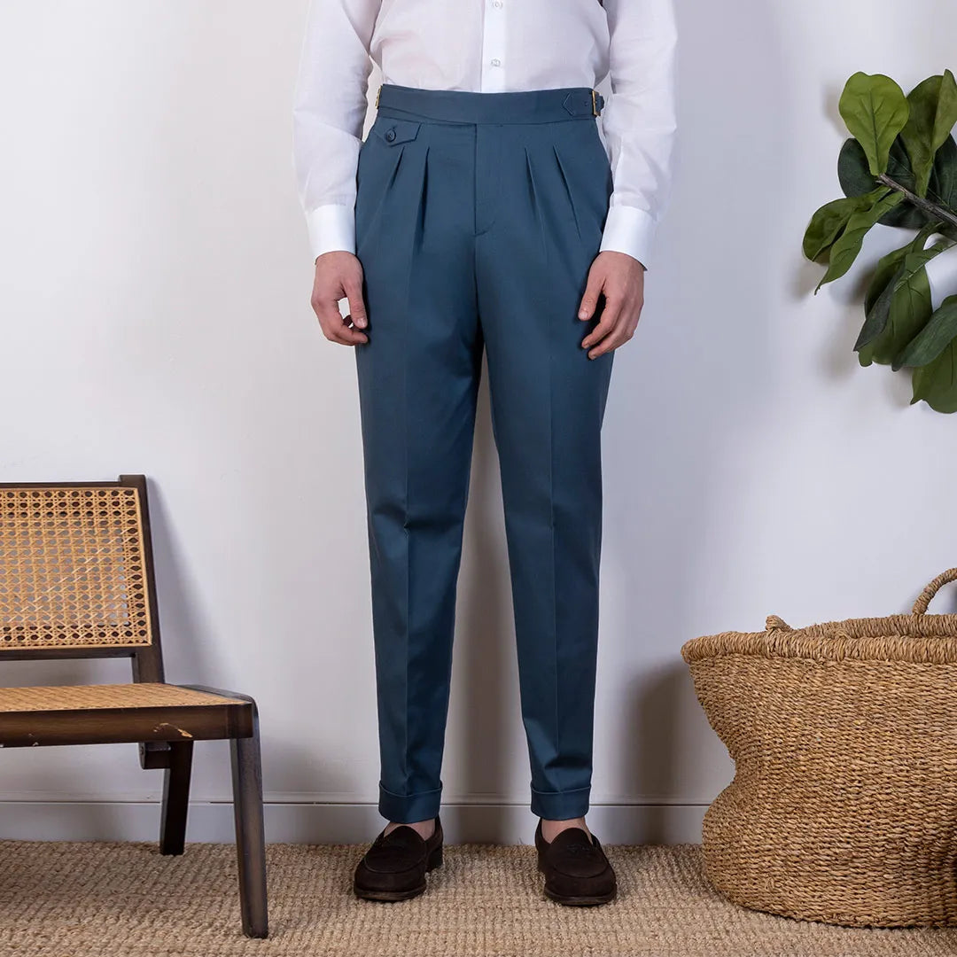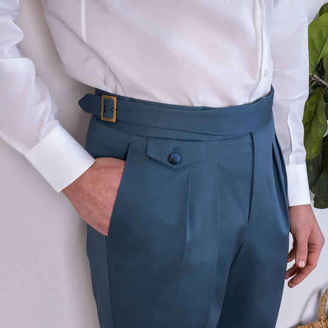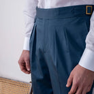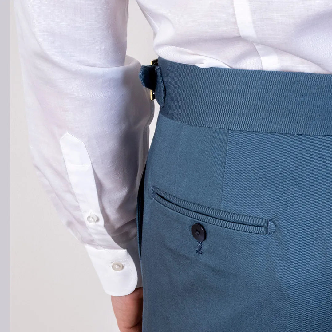 This model stands out for its unique sartorial details: a 4.5 cm high bodice , an extended Gurkha belt and side buckles , which give the garment a distinctive elegance and a customizable fit. The design is completed by a flap on the watch pocket , 2 French pence , front American pockets and back welt pockets , for a perfect balance between functionality and refinement.