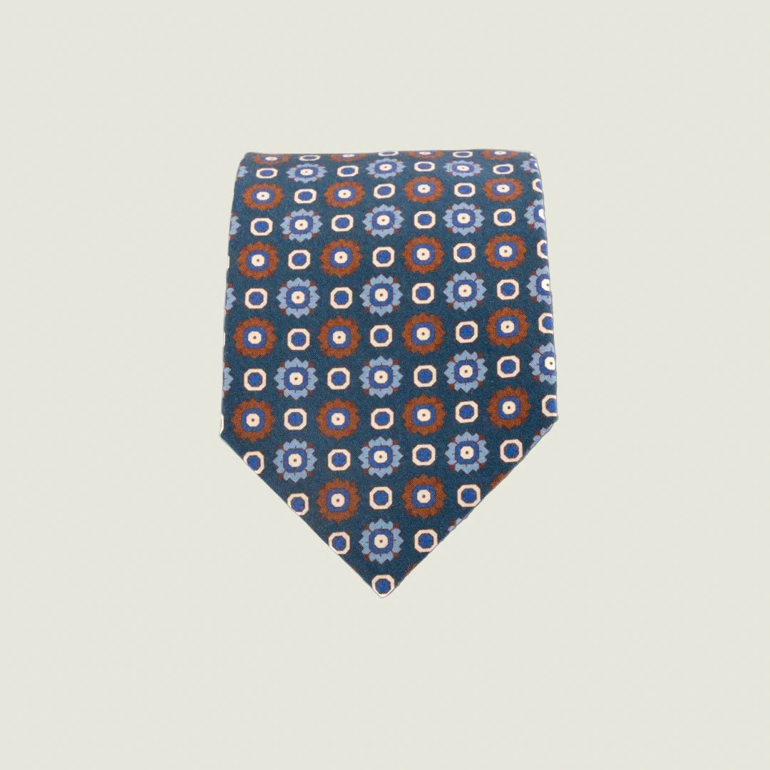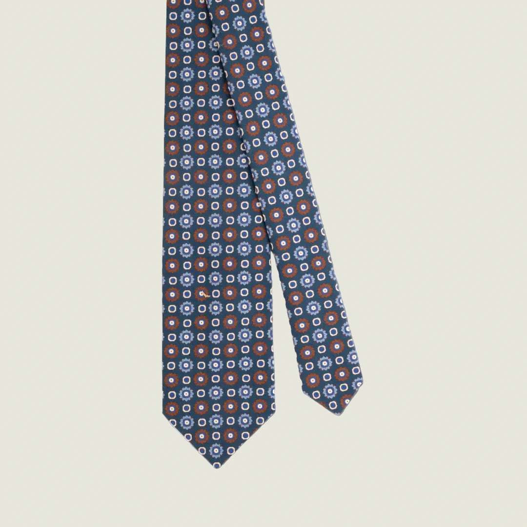 The printed satin silk offers a luminous and soft-touch finish, with an impeccable definition of the floral pattern. The orange and white details create a harmonious contrast on the blue background, making this tie suitable for both formal looks and more daring combinations.