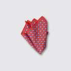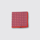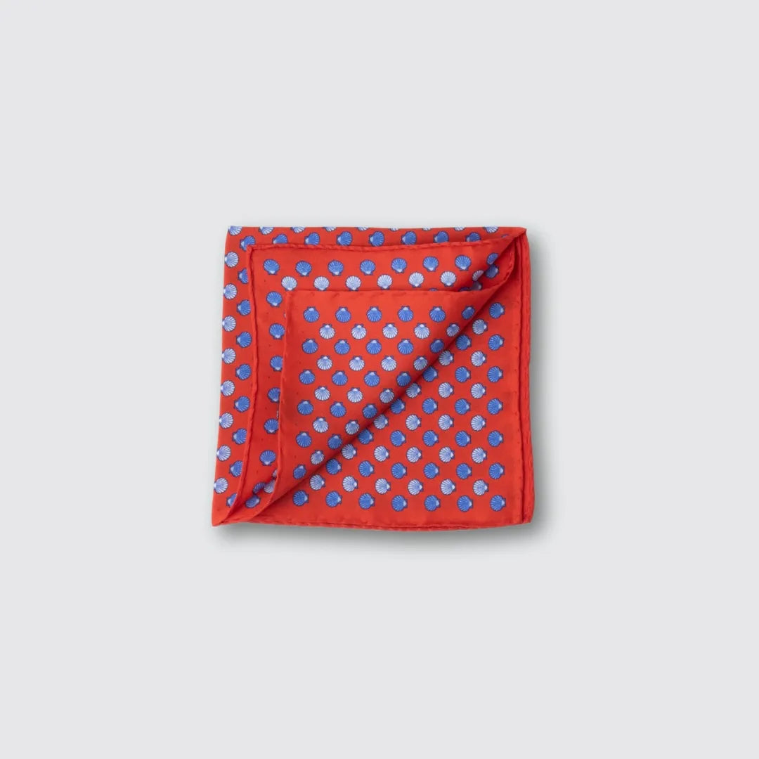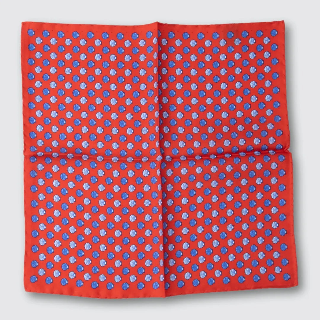 Silk Satin Pocket Square – Blue & Light Blue Shells on Red – Made in Italy