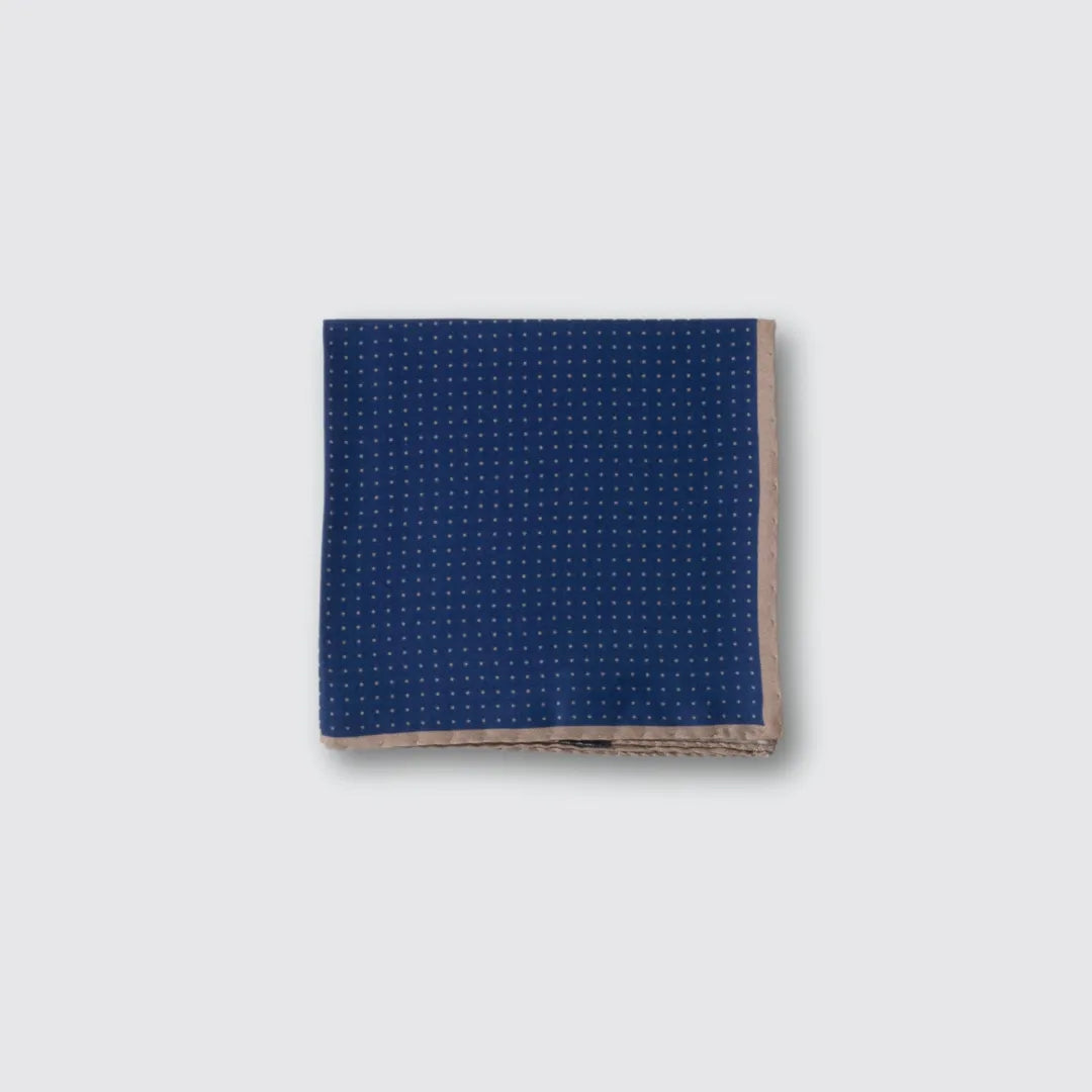 A discreet yet high-impact accessory to complete every look with style. The 100% silk satin pocket square is a must-have for the refined man. The beige micro polka dot motif on a blue background , combined with the contrasting edge, gives elegance and versatility. Perfect for wearing with formal suits or more informal jackets, it is entirely hand-hemmed , a guarantee of craftsmanship and sartorial quality.