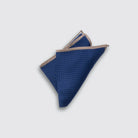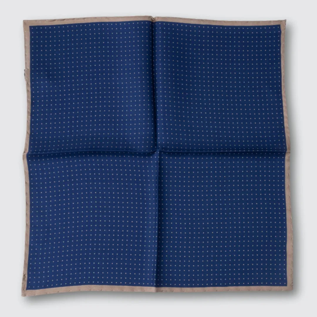 Silk Satin Pocket Square – Brown Micro Polka Dots on Blue with Brown Edge – Made in Italy