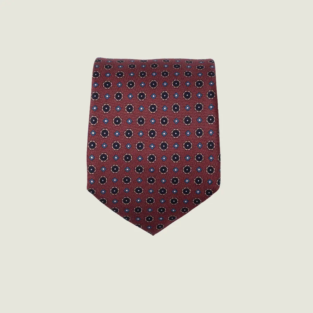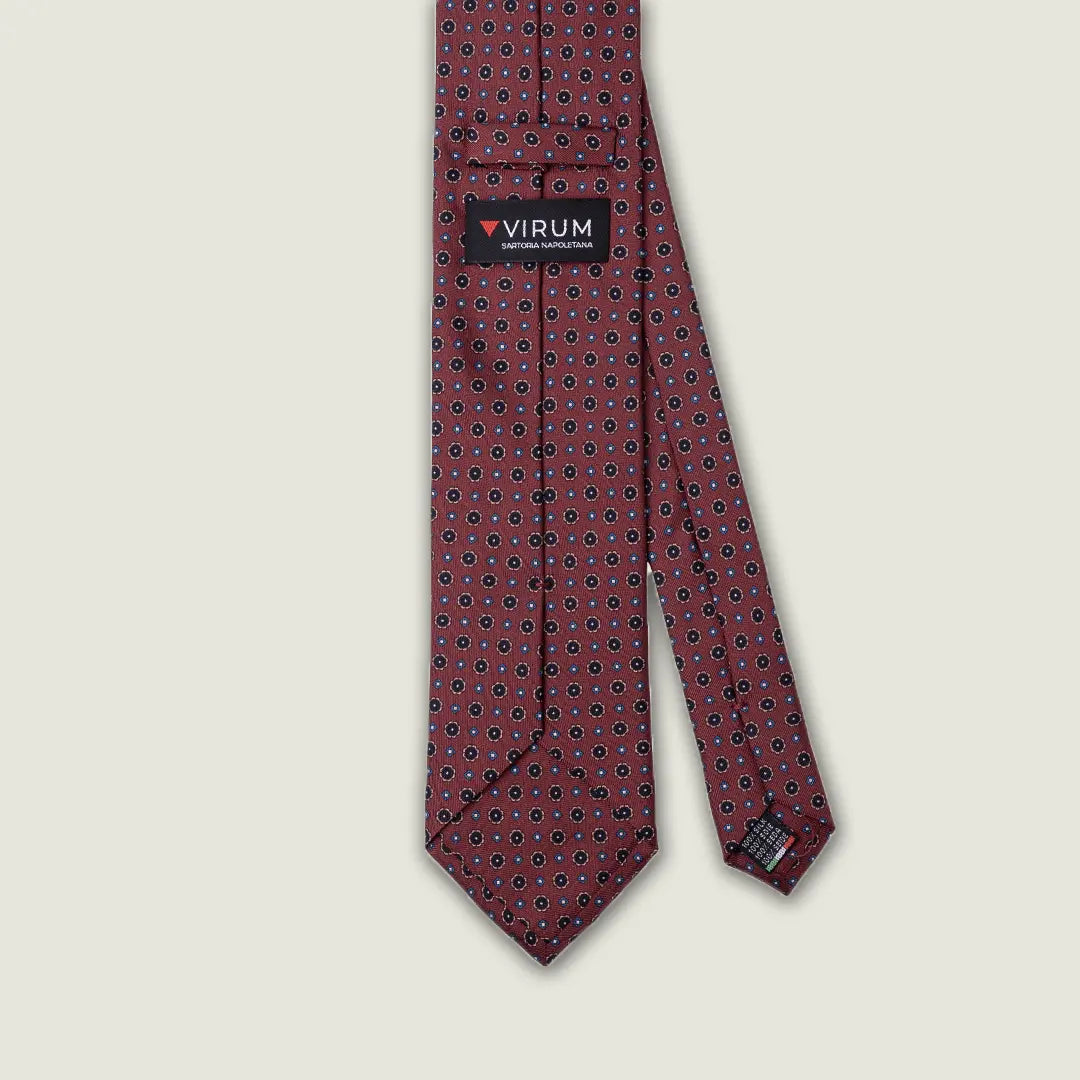 Cravatta artigianale Virum realizzata in pura seta 100% con elegante fantasia geometrica su fondo bordeaux. Un accessorio raffinato e senza tempo, pensato per completare outfit formali e business con carattere e discrezione.