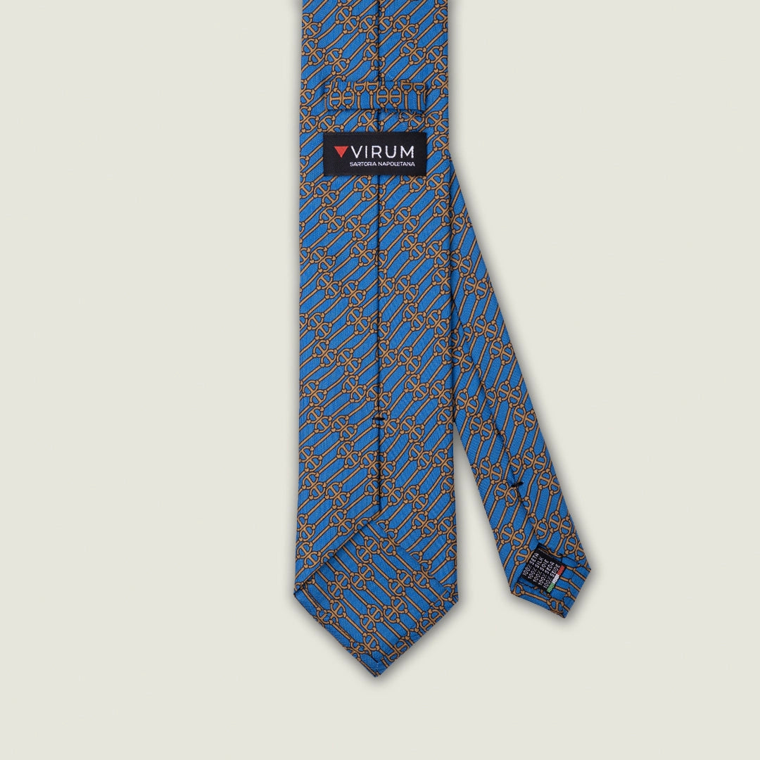 Cravatta Virum realizzata in pura seta, caratterizzata da un elegante fondo azzurro arricchito da un motivo a catena disposto in diagonale.