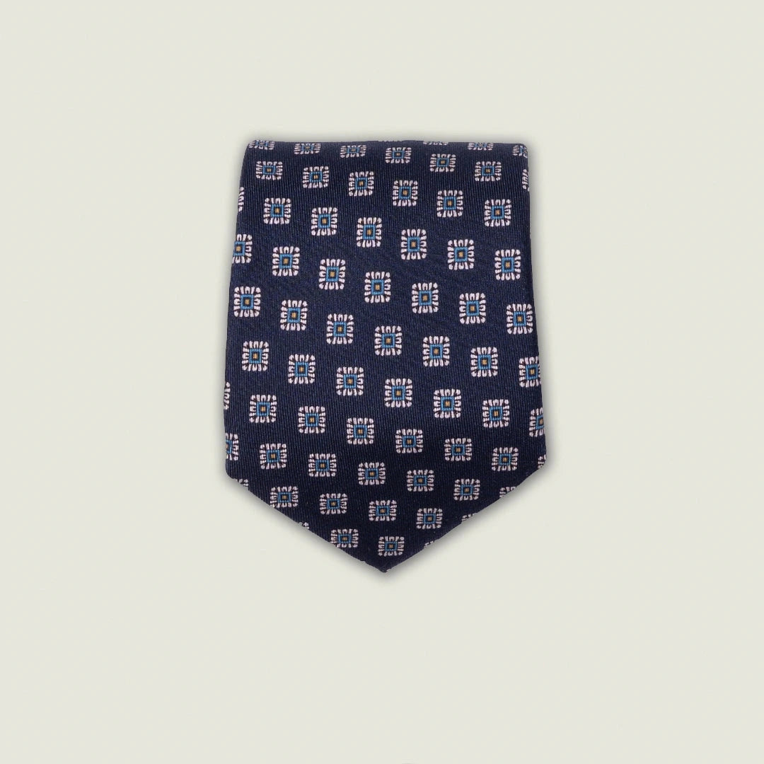 Il fondo blu intenso è arricchito da una fantasia geometrica regolare, raffinata e discreta, pensata per accompagnare con eleganza sia abiti formali sia look business più contemporanei.