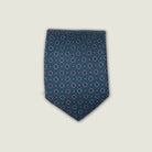 Cravatta artigianale realizzata in pura seta 100%, caratterizzata da un elegante fondo verde petrolio arricchito da un micro disegno geometrico dal gusto classico.