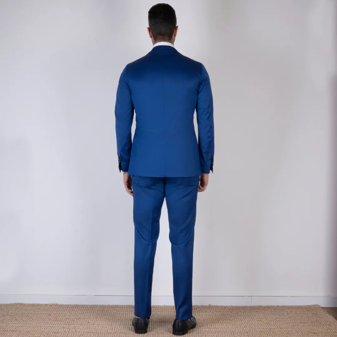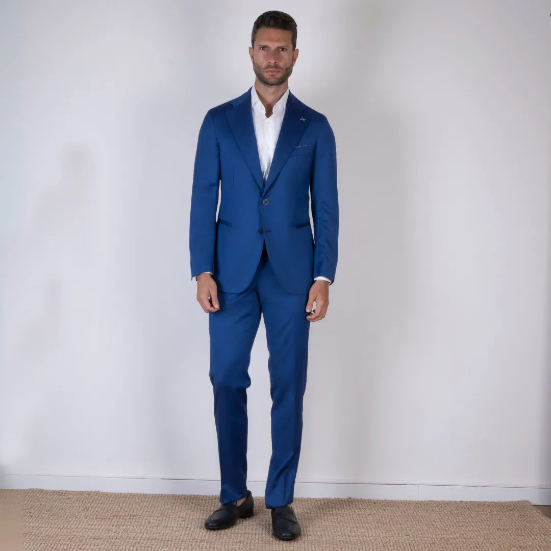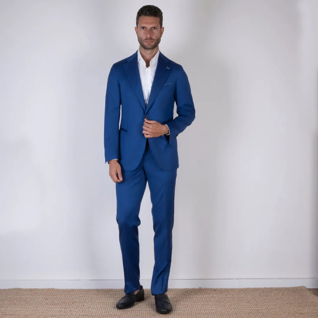 Eleganza decisa e linee pulite per questo abito sartoriale in pura lana color blu vivo. Il taglio classico valorizza la figura, mentre la tonalità intensa lo rende perfetto per chi desidera distinguersi con stile. Ideale per occasioni formali o eventi speciali, è una scelta senza tempo per il guardaroba maschile.