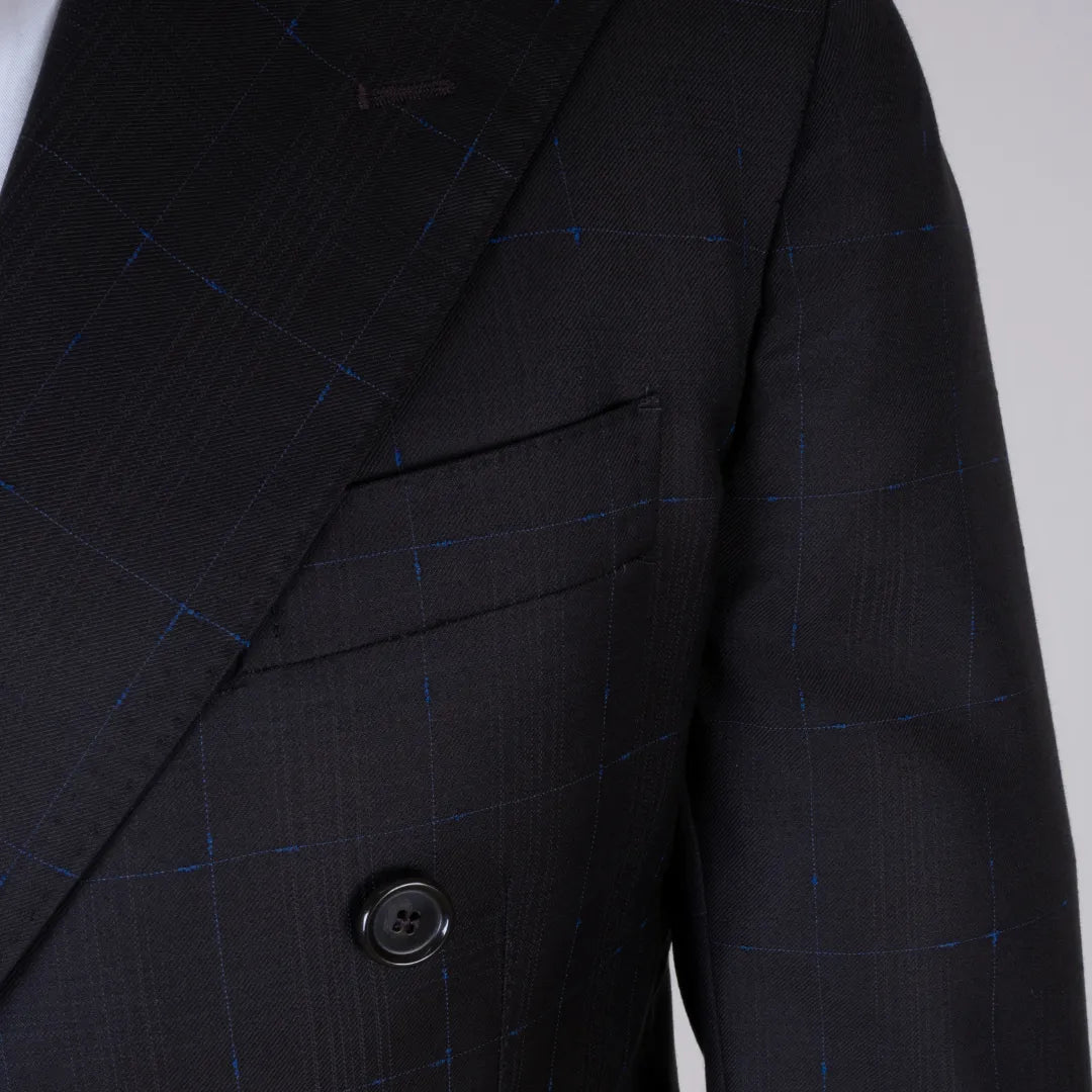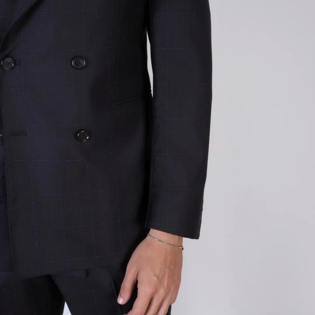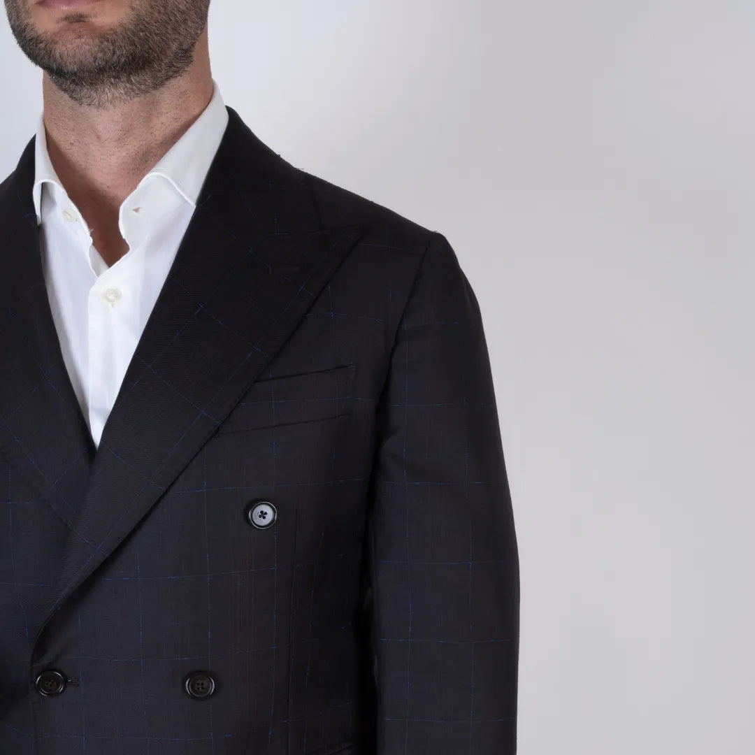 Elegante abito doppiopetto in pura lana, caratterizzato da una raffinata fantasia check azzurro su base marrone. Il taglio sartoriale e il tessuto leggero lo rendono perfetto per contesti formali o cerimonie. Proposto nella taglia 46.