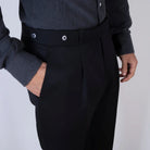 Pantalone sartoriale con una pince frontale, realizzato in pura lana nera. La lavorazione artigianale assicura una vestibilità elegante e confortevole, ideale per completare look formali o business casual. Rifinito con cinta sartoriale e tasche posteriori a filetto con bottone.