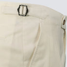 Il color panna in riviera Holland & Sherry, rende questo pantalone molto facile da abbinare, unito alla costruzione retrò con le due pinces alla francese e le fibbiette laterali, potrà essere la vostra base per un outfit ricercato.
