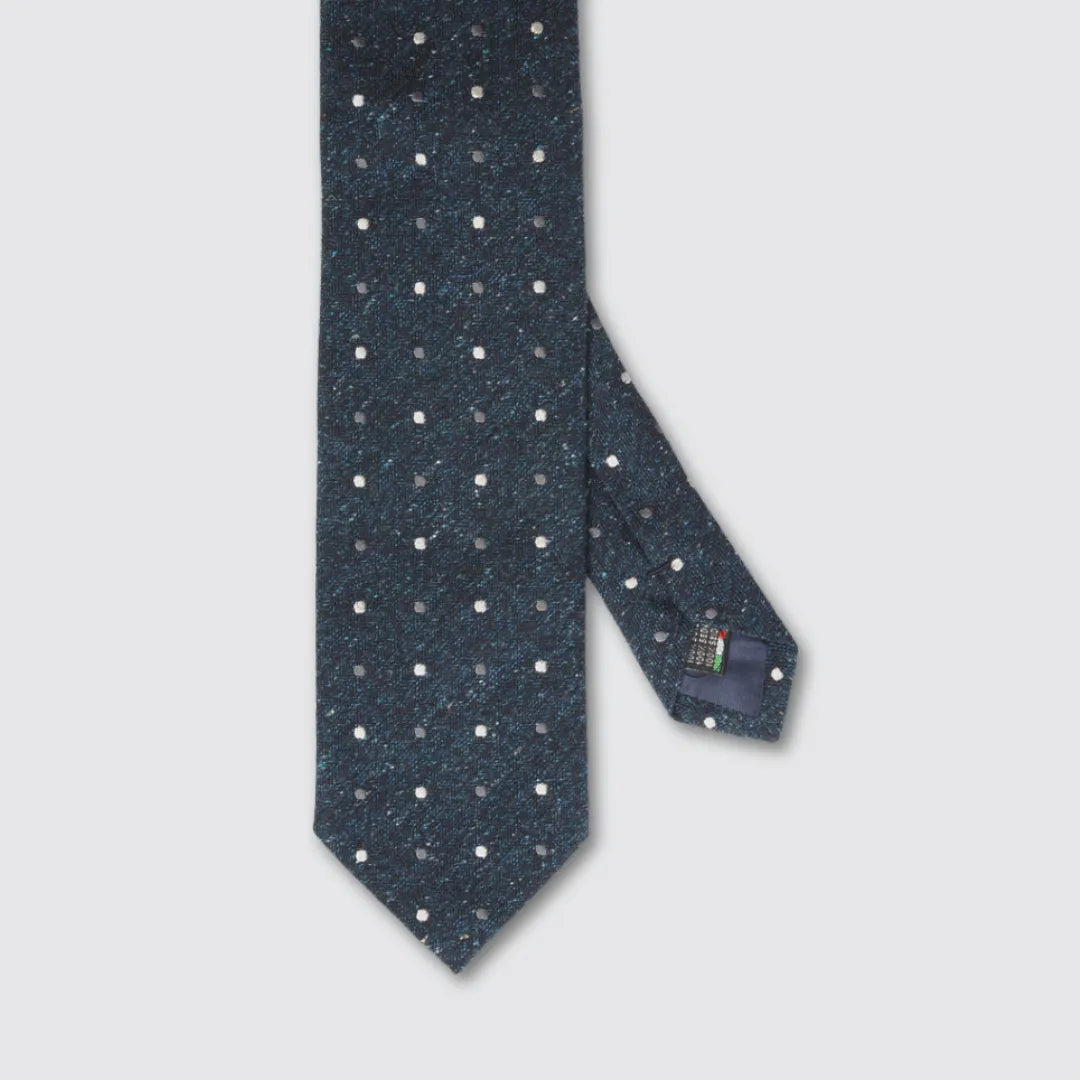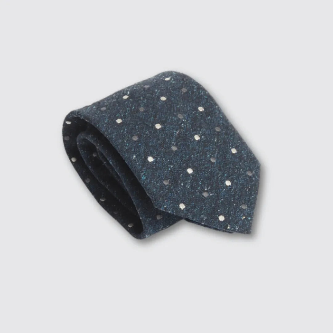 A sophisticated and elegant tie, perfect for those who want a distinctive but discreet accessory. This 3-fold model in 100% silk stands out for its small grey and white polka dot pattern on a blue background, a versatile design that adapts perfectly to formal and casual chic looks.