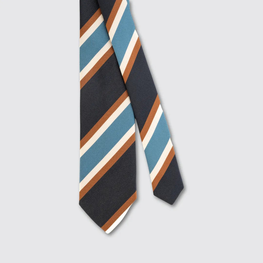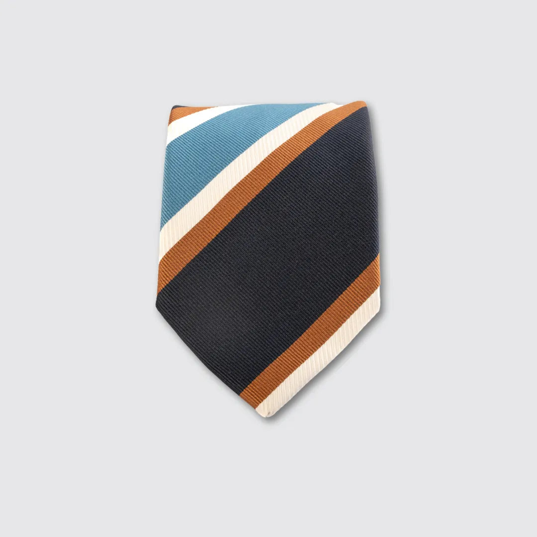 A refined and elegant accessory, perfect for those who want to stand out with style. This 3-fold regimental tie in 100% jacquard silk is characterized by its striped pattern in shades of blue, brown, cream and powder blue. A classic and versatile design, ideal for completing formal looks with a touch of personality and sophistication.