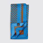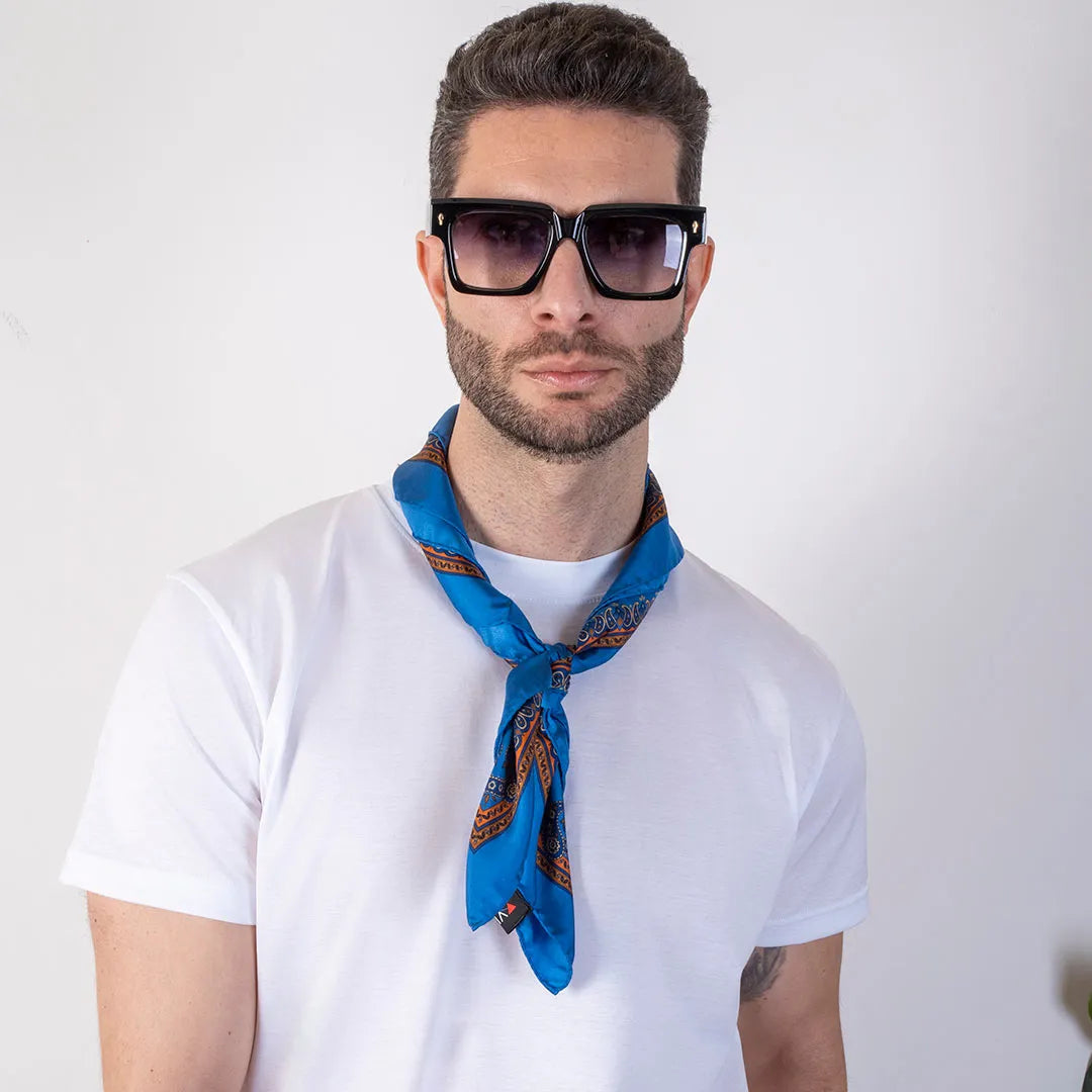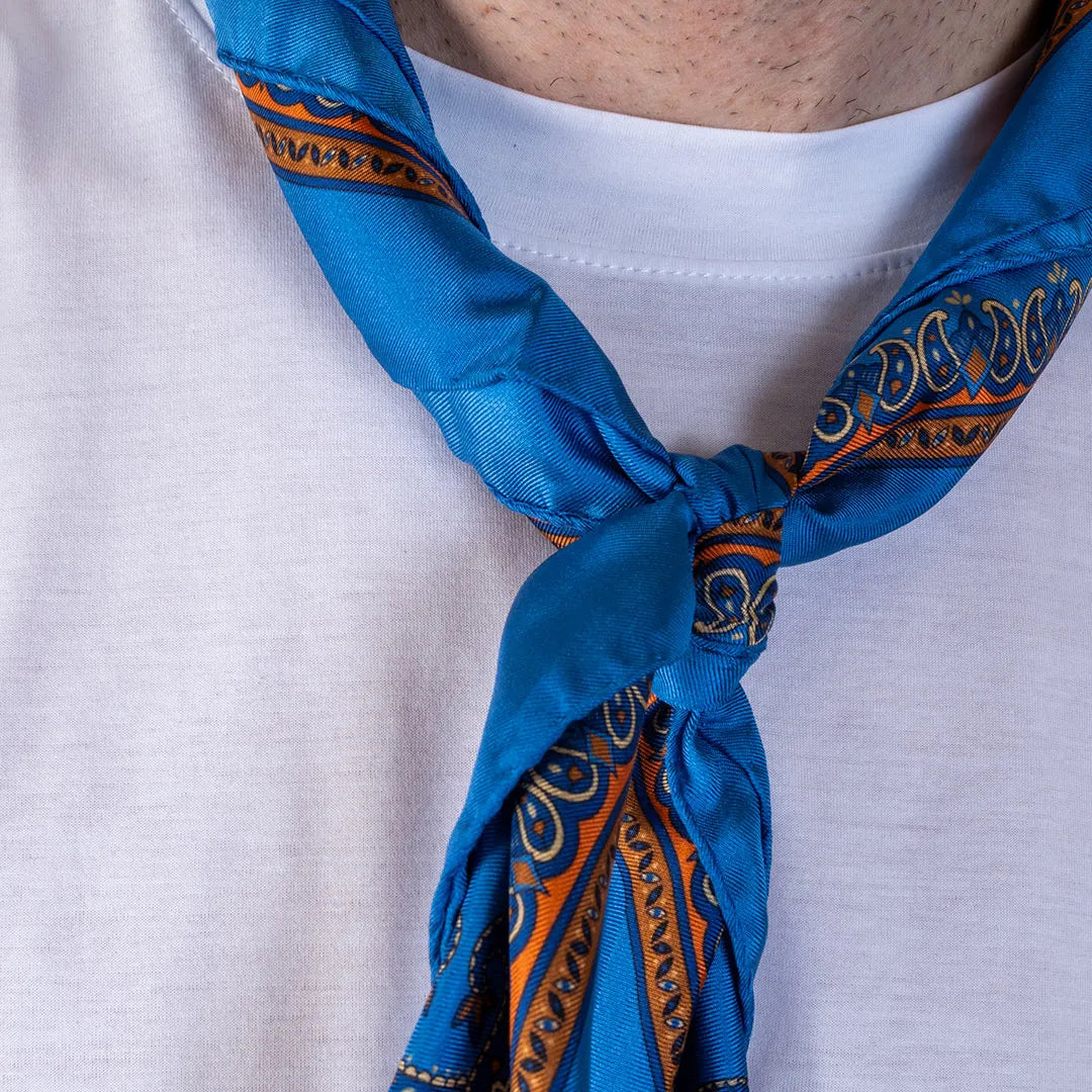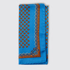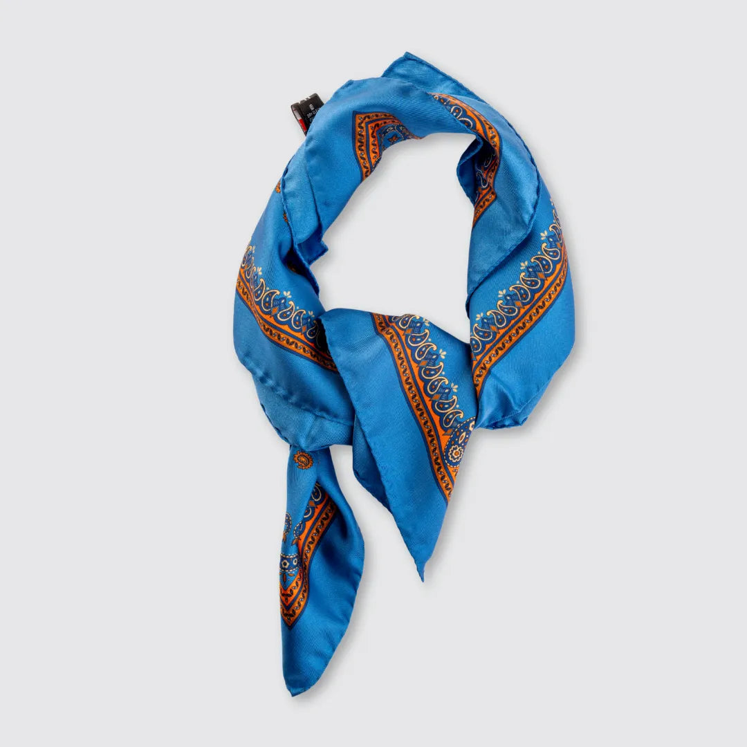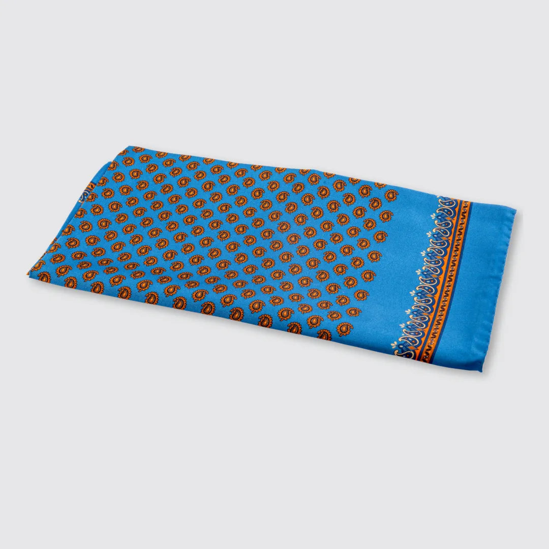 An accessory that adds character to every outfit. The light blue silk scarf with orange paisley pattern and decorative border is made of 100% printed silk . Entirely handmade in Italy, it represents the perfect union between craftsmanship and timeless style.