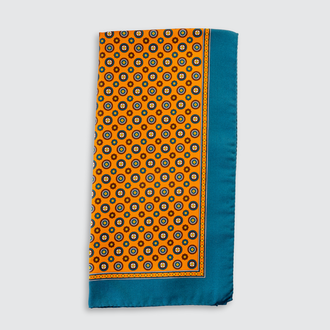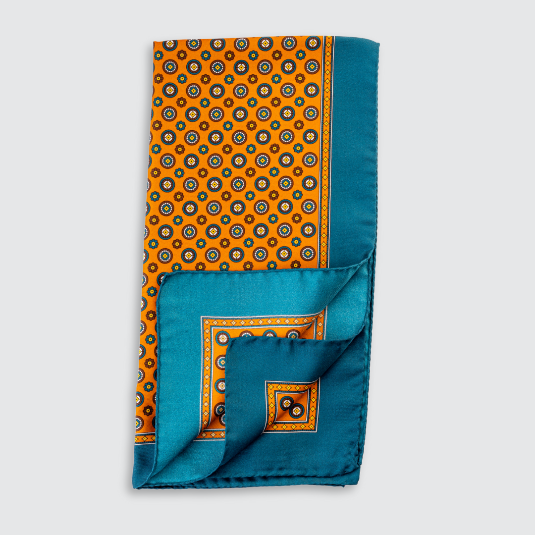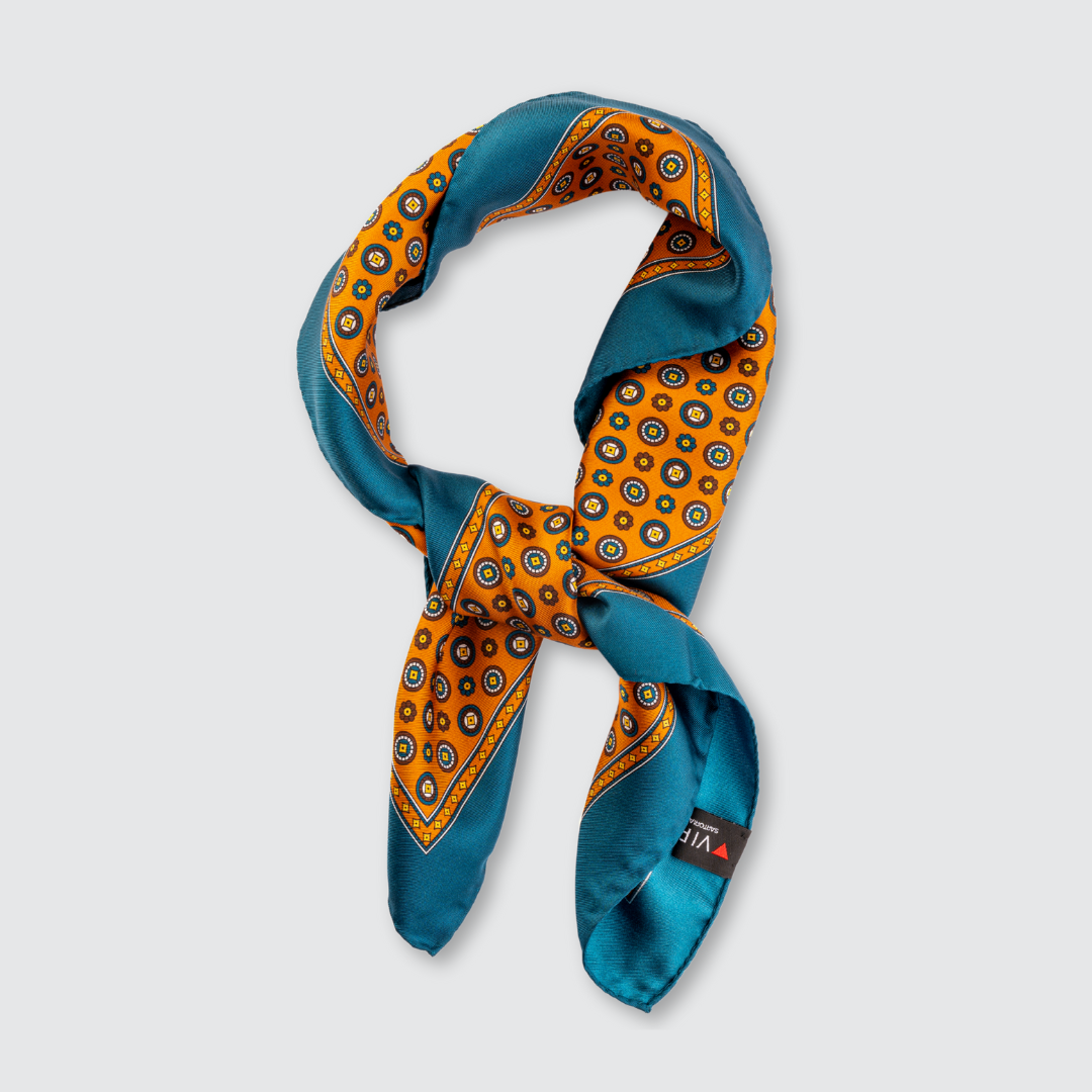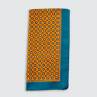 Elegance, color and artisan tradition meet in this pure silk scarf , printed with geometric patterns with a vintage flavor in mustard yellow and petrol green . Perfect for adding a distinctive touch to any outfit, thanks to the natural shine of the silk and the artisanal care of the finishes.