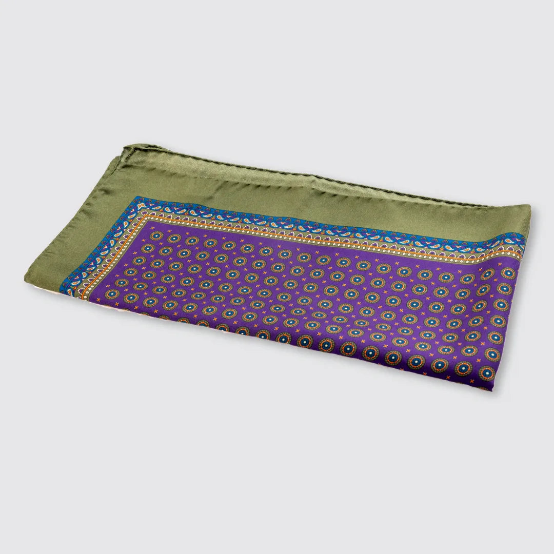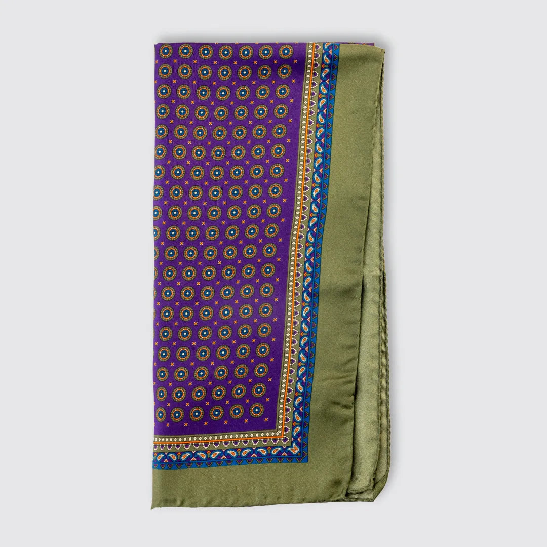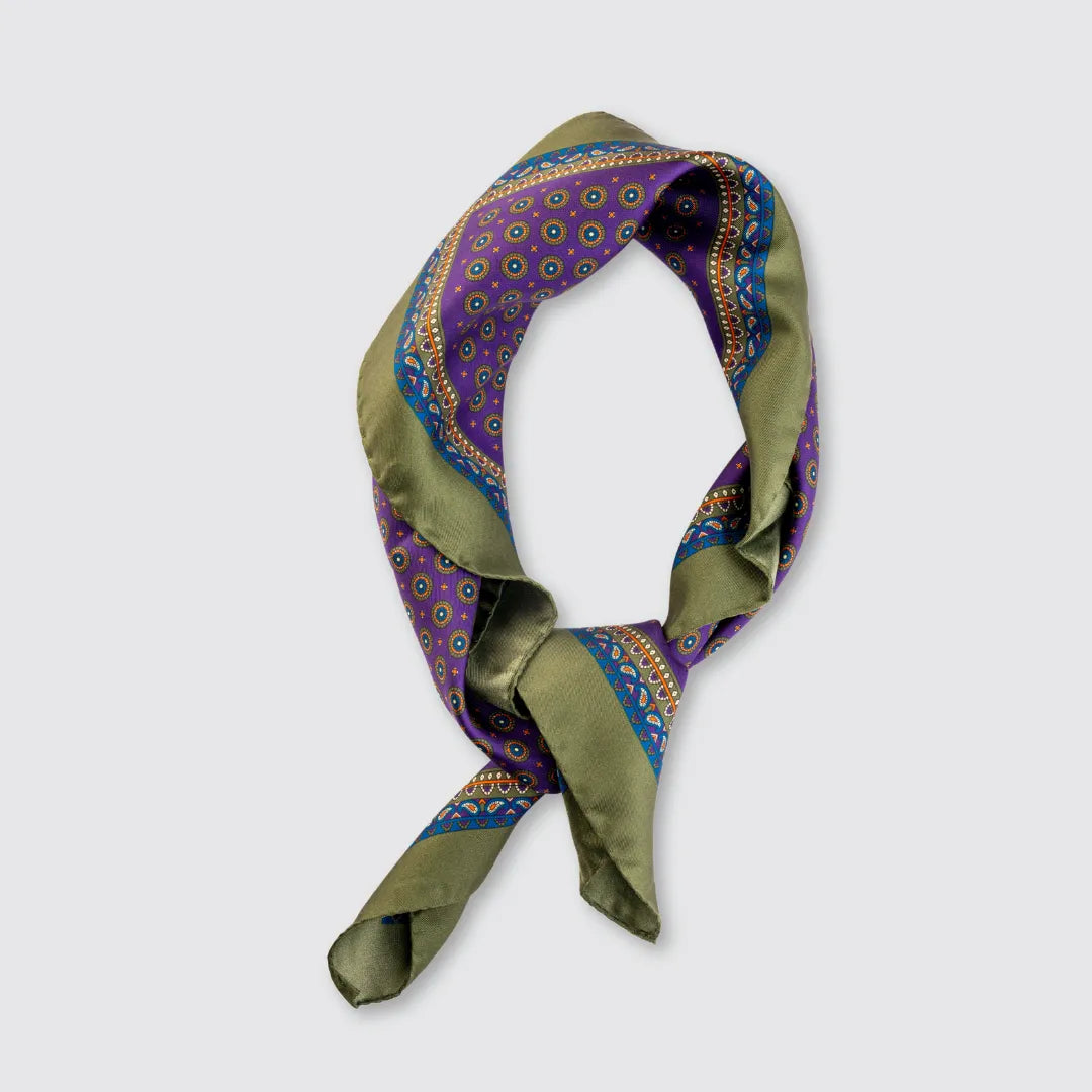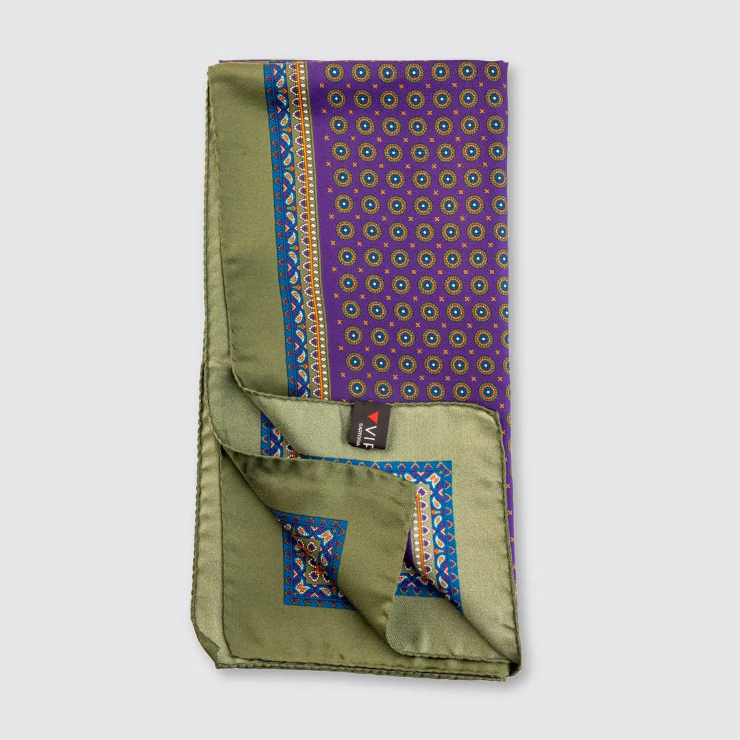 A touch of color and sophistication for every style. The purple silk scarf with geometric details and olive green border is made of 100% printed silk , perfect for giving personality to even the simplest look.
