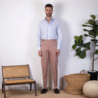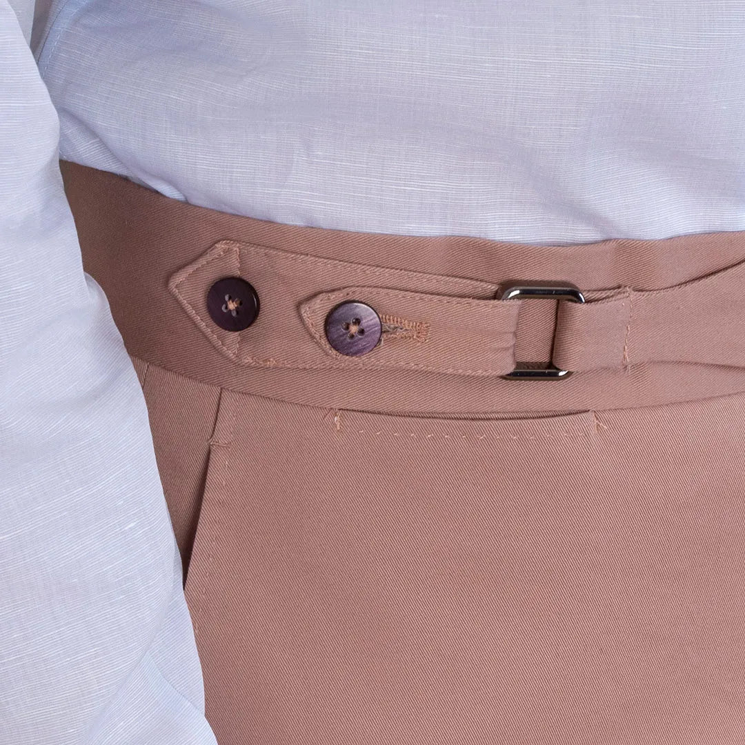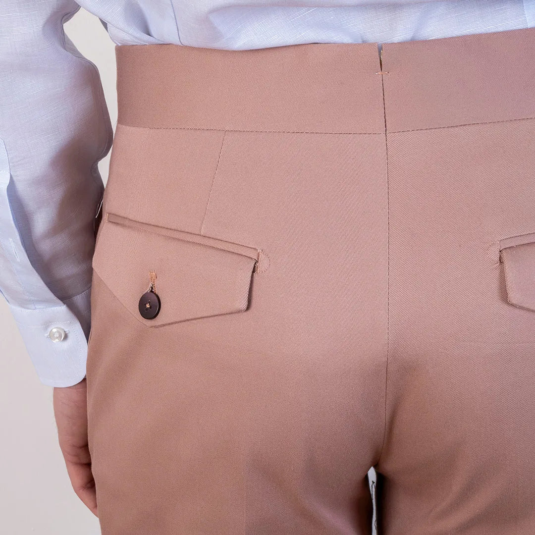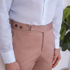 This model stands out for its 4.5 cm high bodice and the tailored belt with buckle and double side button , adjustable to ensure a tailored fit and a touch of elegance. The design without pleats gives a clean and sophisticated line, while the front American pockets and the back welt pockets complete the look with a perfect balance between aesthetics and functionality.