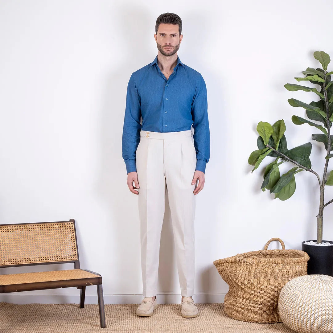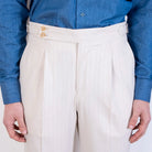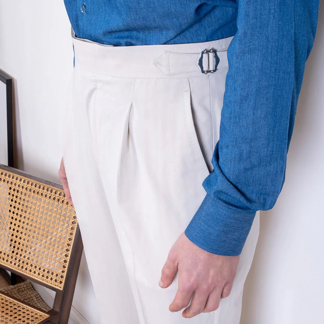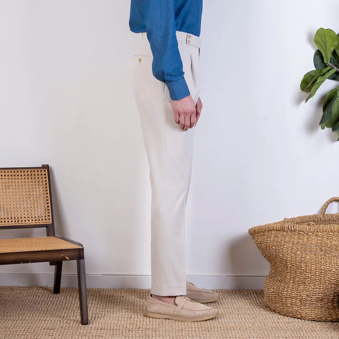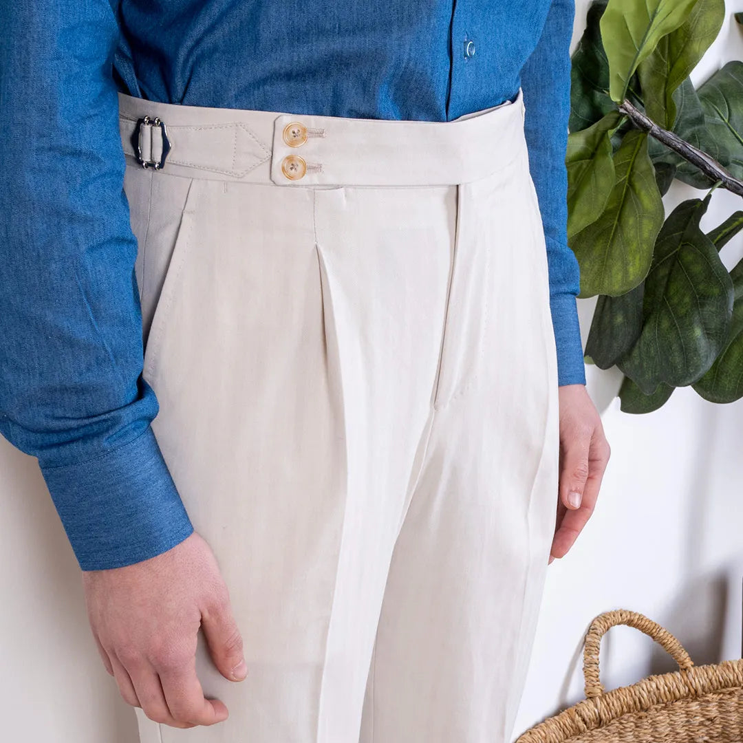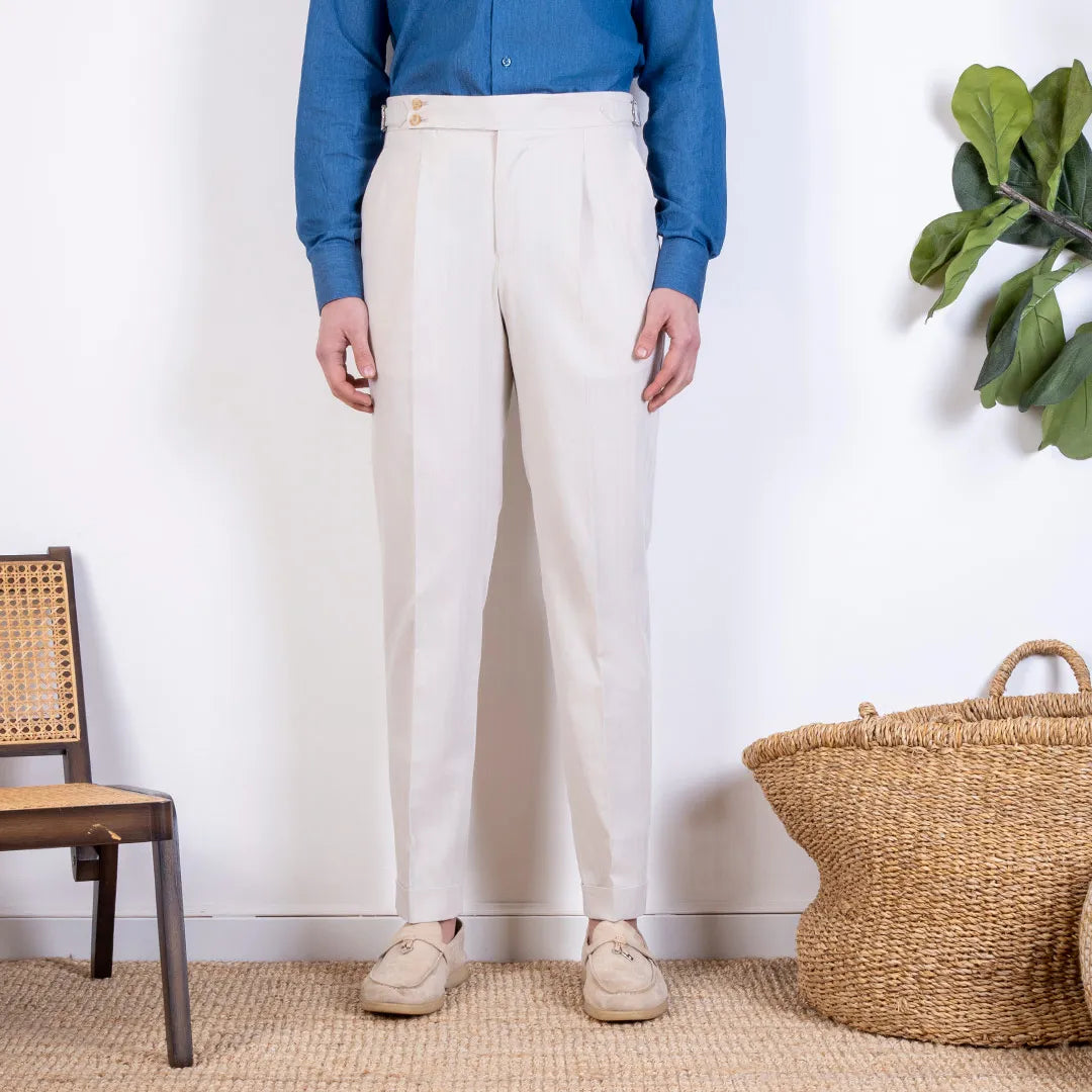 Designed for an excellent fit and superior comfort, it features a front pleat , a 4.5 cm high tailored belt , side adjuster buckles and a double button extension . A tailored garment designed for those who want to stand out with discretion and refinement.