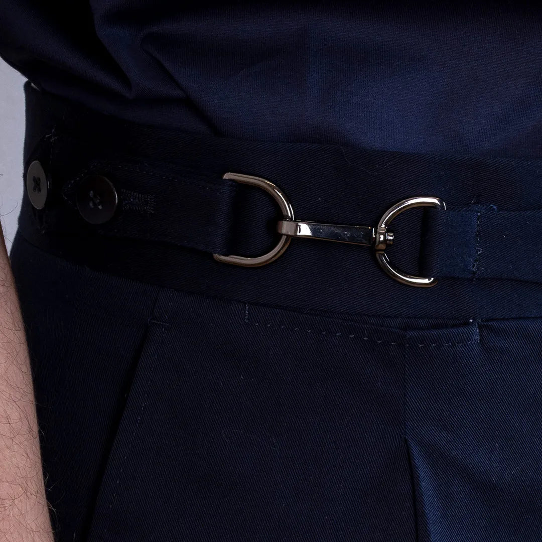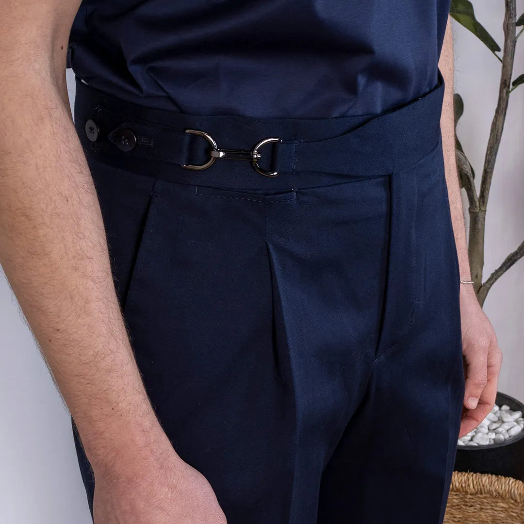 This style features a 4.5cm high bodice and a tailored belt with buckle and snap hook with double side button , adjustable for a tailored fit and a touch of refinement. The presence of 1 pence gives the perfect balance between comfort and structure, while the front American pockets and rear welt pockets add functionality and class.
