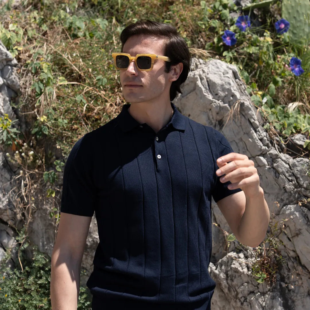 Questa polo in cotone calato è l’emblema di un’eleganza rilassata ma curata nei minimi dettagli. Lavorata a maglia con coste larghe verticali, è realizzata in puro cotone 100%, per garantire traspirabilità e comfort durante tutta la giornata. Il fondo maglia e il fondo manica sono rifiniti con lavorazione a costine elastiche, per una vestibilità aderente ma comoda. Il colletto classico e l’abbottonatura a tre bottoni completano un capo essenziale del guardaroba estivo maschile, perfetto da indossare con shorts sartoriali o pantaloni leggeri.