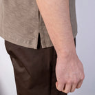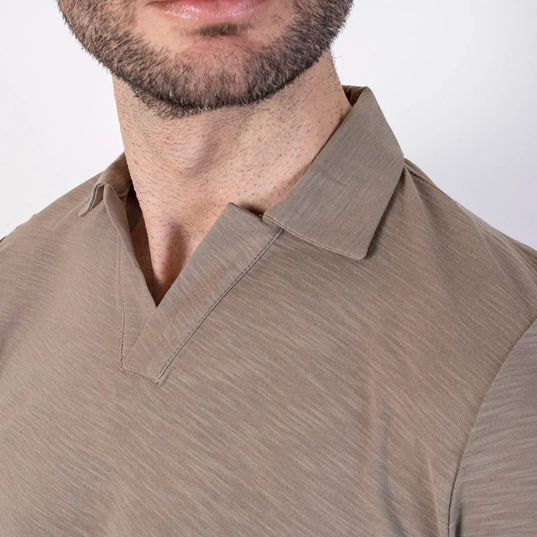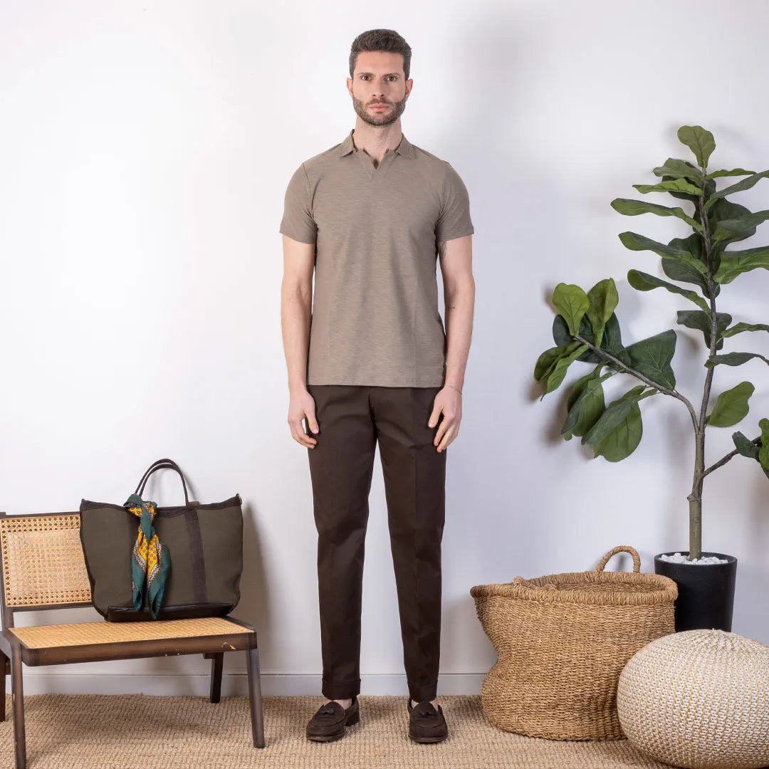 Fresh, light and essential. This beige cotton jersey polo with derby collar is designed to offer comfort and style throughout the day. The slub effect gives depth to the texture of the fabric, while the natural elasticity ensures freedom of movement and an impeccable fit.