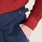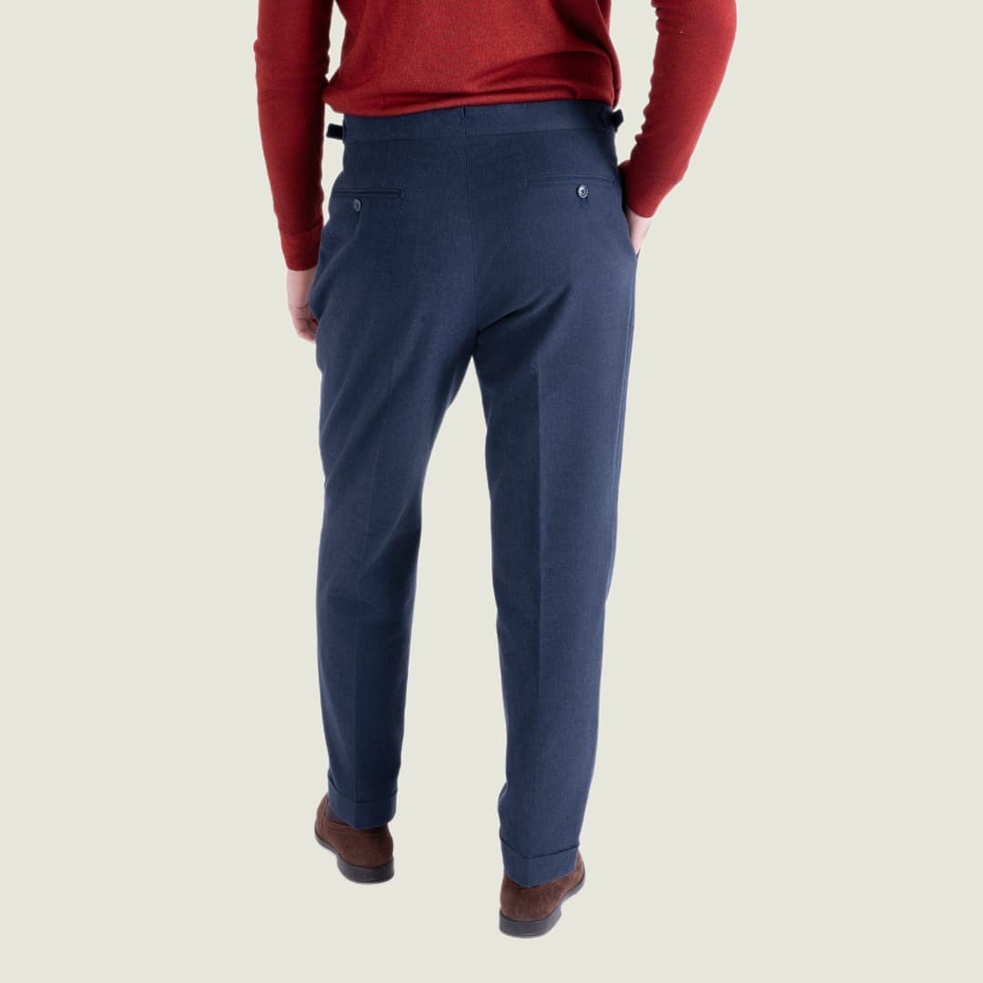 Il Pantalone Sartoriale Contemporary in 100% caldo cotone Blu è pensato per chi desidera un capo versatile, elegante e perfetto per la stagione autunno/inverno. La costruzione con una pince all'italiana, bustino alto e fibbiette laterali dona un equilibrio impeccabile tra comfort, stile e tradizione sartoriale napoletana.