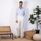 Description: An essential palette that blends the freshness of the sky with the purity of the sand. The Neapolis Bush tailored trousers in cream tone pair perfectly with the light blue cotton and linen blend shirt, for effortless elegance. The dry lines of the trousers and the tailored details such as the double pleats and the side strap express a refined evolution of the minimal style.