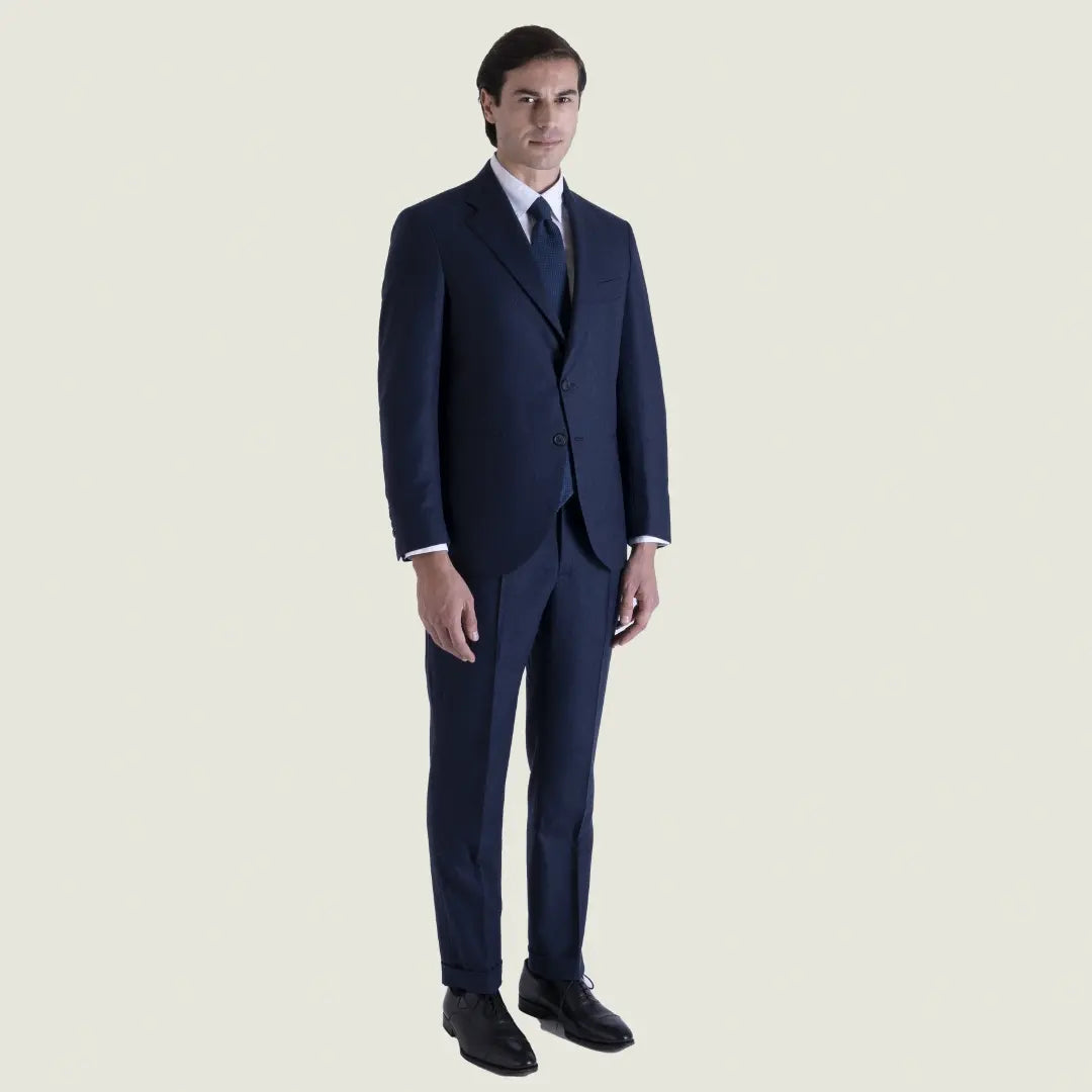 L’abito sartoriale in flanella lana–cashmere blu rappresenta uno dei massimi esempi della nostra tradizione partenopea reinterpretata in chiave contemporanea. Un capo pensato per l’uomo che desidera un’eleganza autentica, una vestibilità impeccabile e un comfort che accompagna naturalmente i movimenti.
