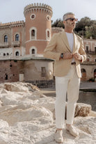 Descrizione: Un look che cattura l’essenza della riviera italiana, tra eleganza rilassata e luce dorata. La giacca beige, destrutturata e dal taglio fluido, si abbina con naturalezza a una t-shirt bianca e pantaloni off white, creando un effetto fresco e sofisticato al tempo stesso.